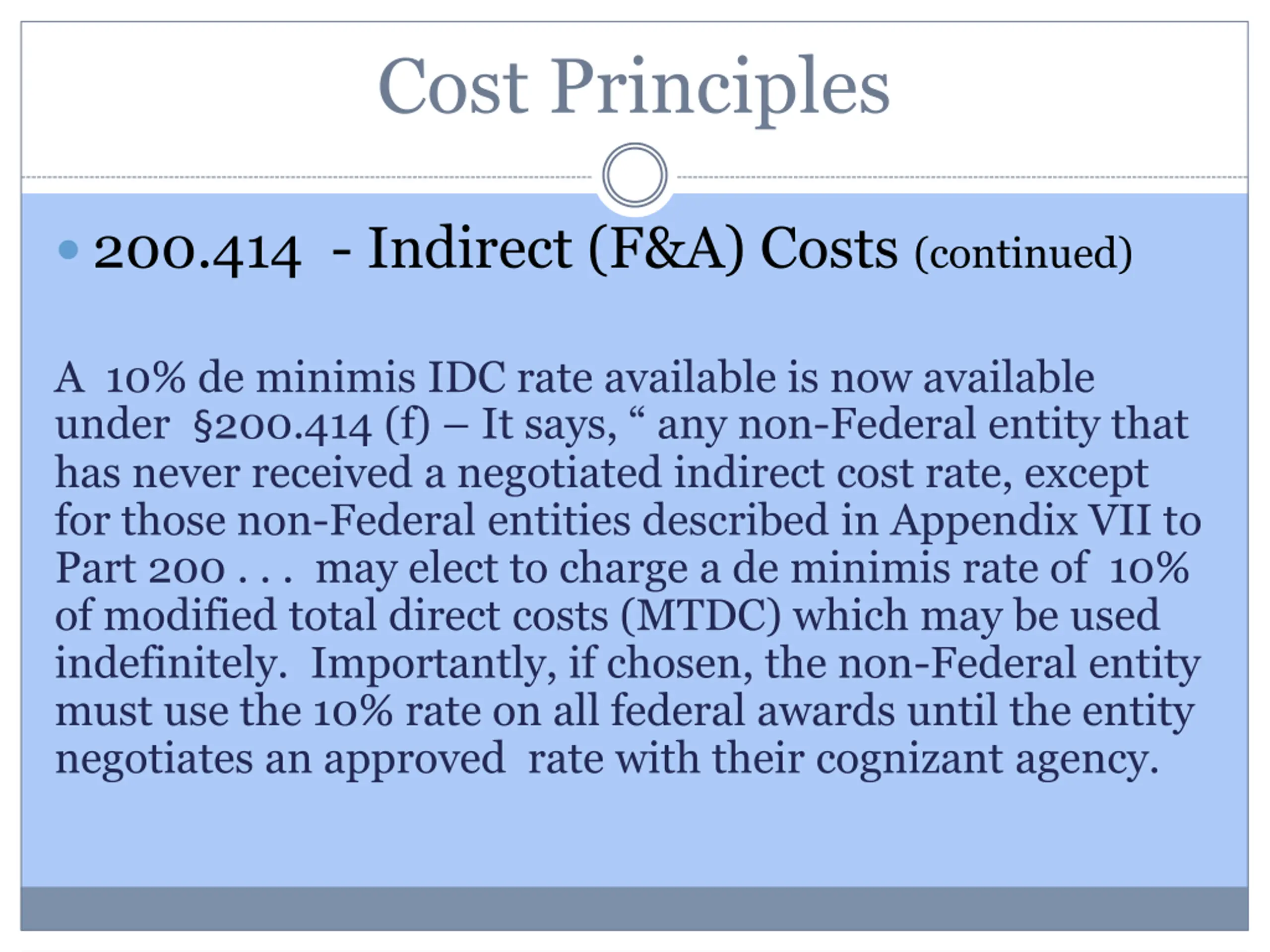 Cost Principles 200.414 - Indirect (F&A) Costs (continued) A 10% de minimis IDC rate available is now available under 200.414 (f) It says, any non-Federal entity that has never received a negotiated indirect cost rate, except for those non-Federal entities described in Appendix VII to Part 200 . . . may elect to charge a de minimis rate of 10% of modified total direct costs (MTDC) which may be used indefinitely. Importantly, if chosen, the non-Federal entity must use the 10% rate on all federal awards until the entity negotiates an approved rate with their cognizant agency.