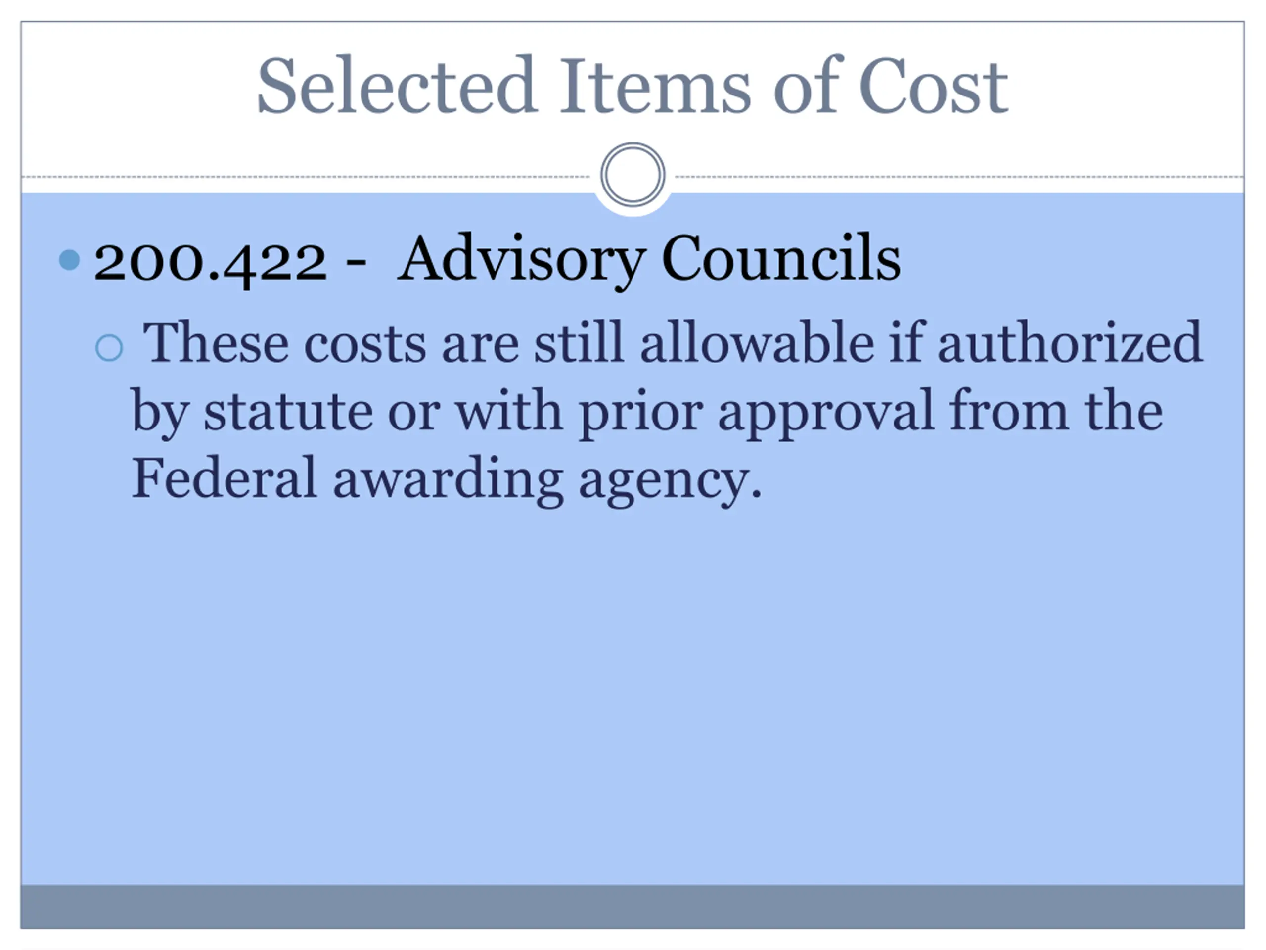 Selected Items of Cost 200.422 - Advisory Councils These costs are still allowable if authorized by statute or with prior approval from the Federal awarding agency.