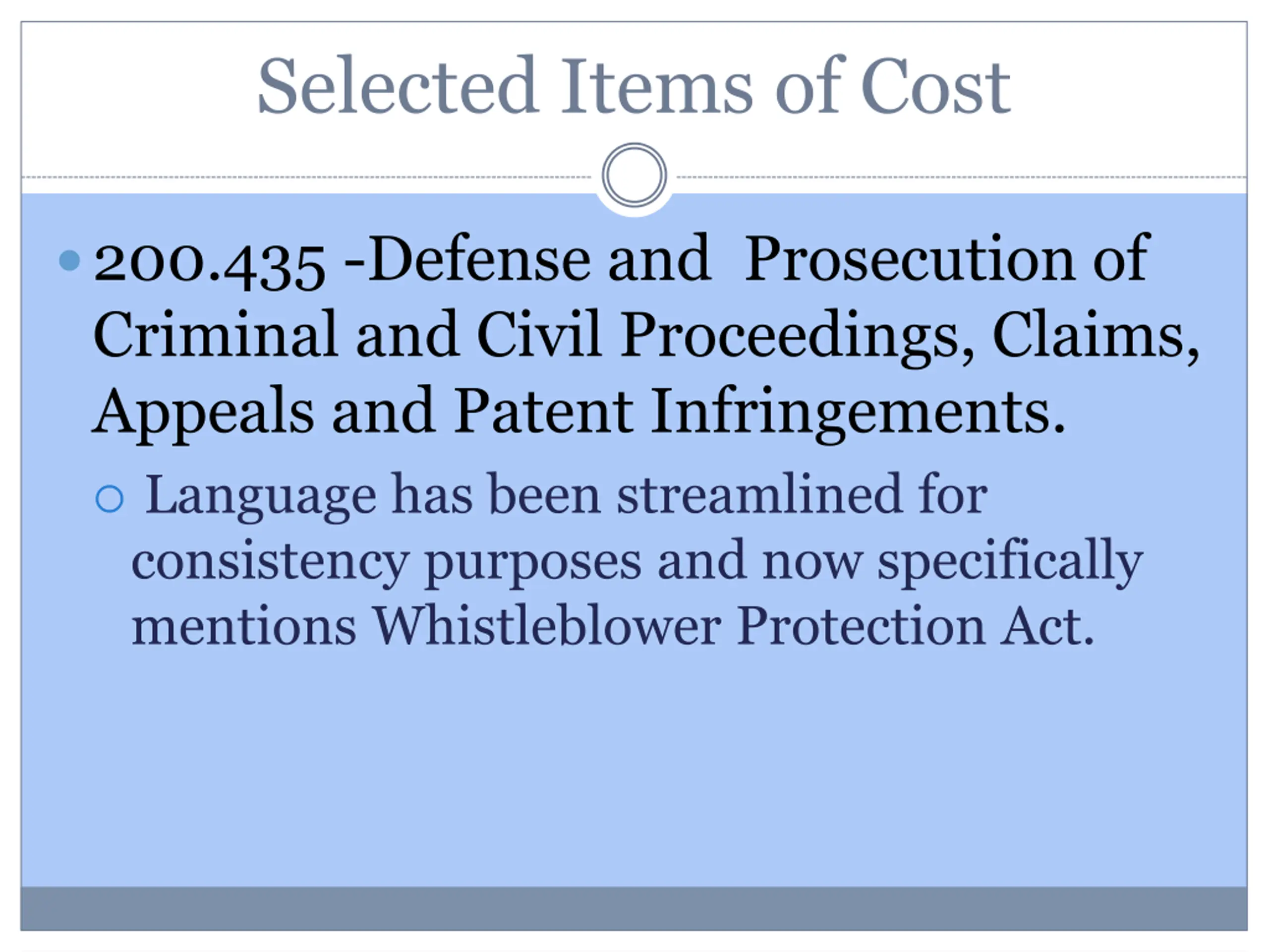 Selected Items of Cost 200.435 -Defense and Prosecution of Criminal and Civil Proceedings, Claims, Appeals and Patent Infringements. Language has been streamlined for consistency purposes and now specifically mentions Whistleblower Protection Act.