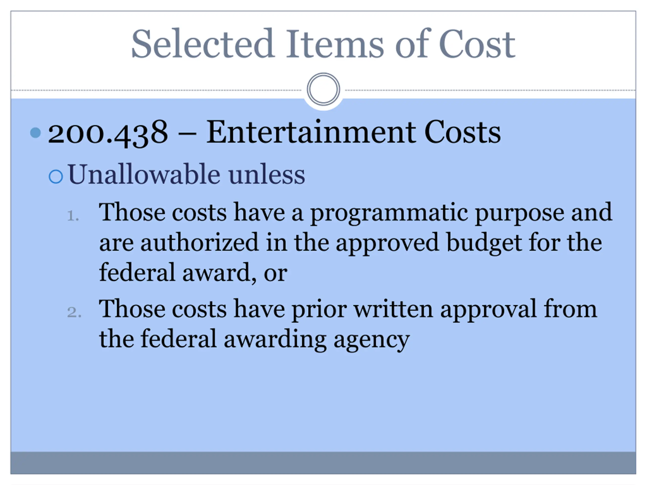 Selected Items of Cost 200.438 Entertainment Costs Unallowable unless 1. Those costs have a programmatic purpose and are authorized in the approved budget for the federal award, or 2. Those costs have prior written approval from the federal awarding agency