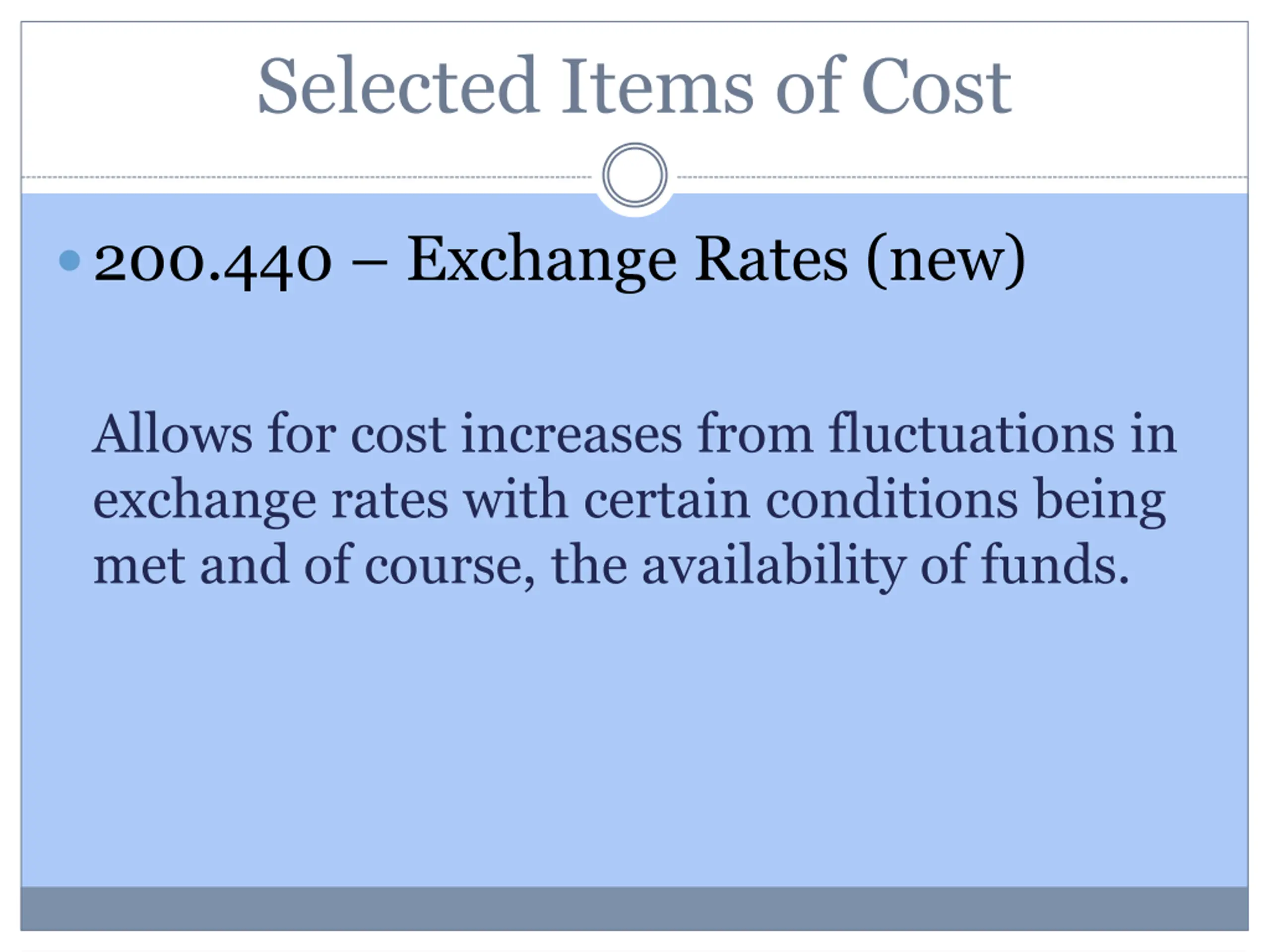 Selected Items of Cost 200.440 Exchange Rates (new) Allows for cost increases from fluctuations in exchange rates with certain conditions being met and of course, the availability of funds.