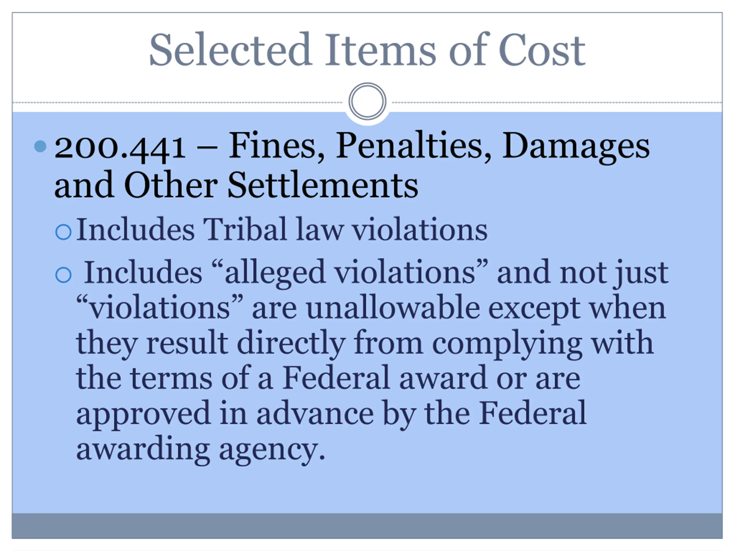 Selected Items of Cost 200.441 Fines, Penalties, Damages and Other Settlements Includes Tribal law violations Includes alleged violations and not just violations are unallowable except when they result directly from complying with the terms of a Federal award or are approved in advance by the Federal awarding agency.