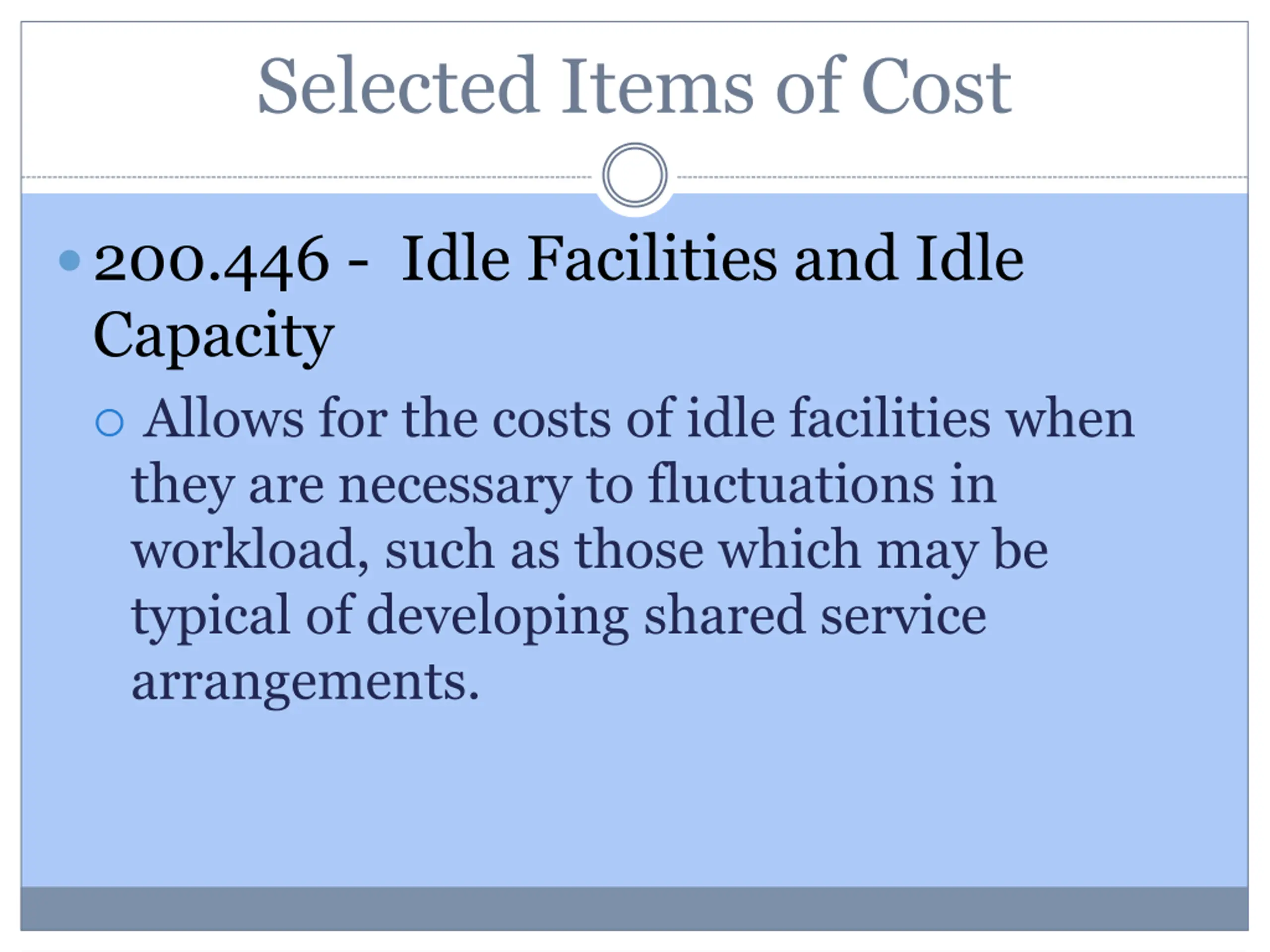 Selected Items of Cost 200.446 - Idle Facilities and Idle Capacity Allows for the costs of idle facilities when they are necessary to fluctuations in workload, such as those which may be typical of developing shared service arrangements.