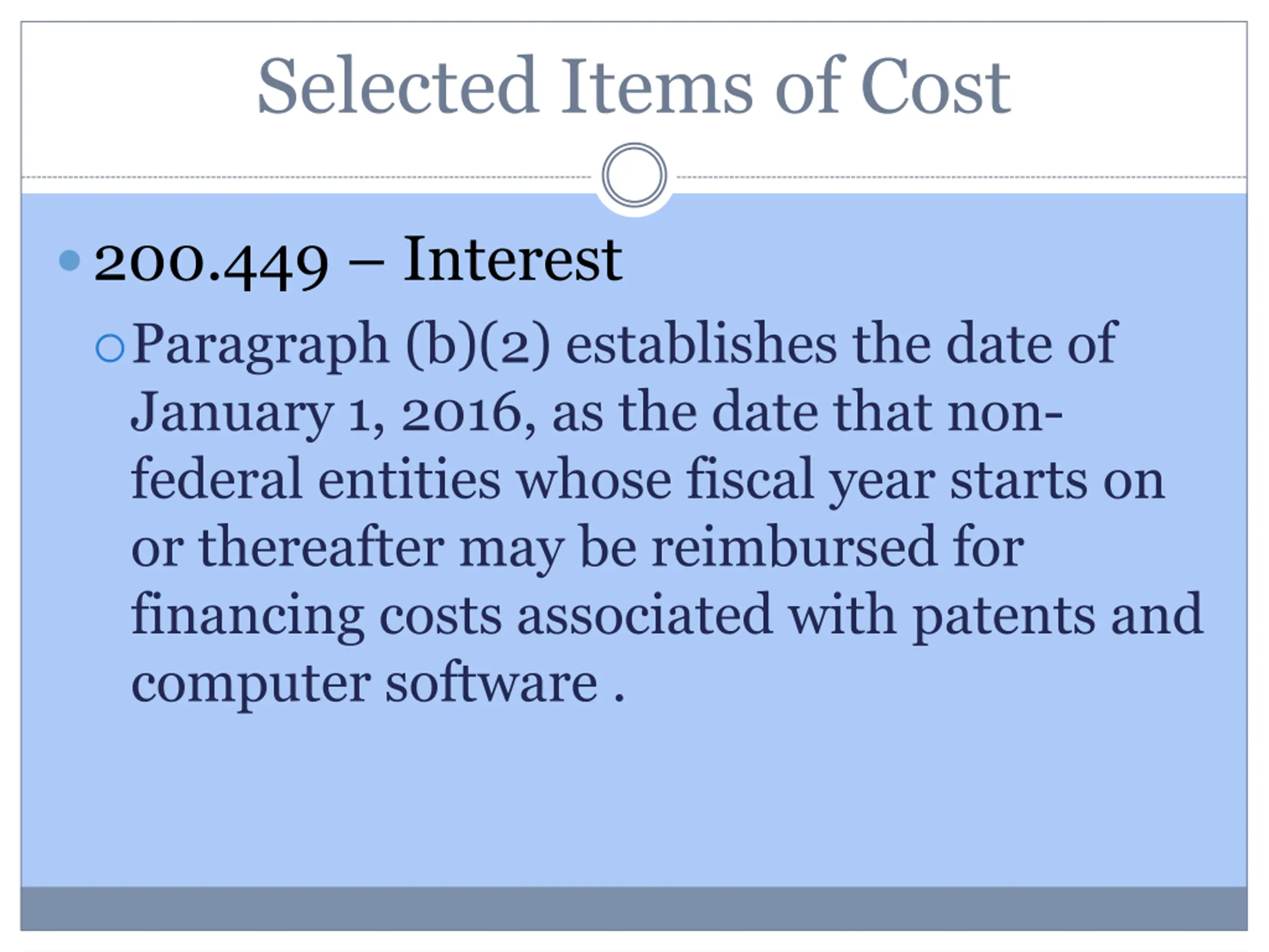 Selected Items of Cost 200.449 Interest Paragraph (b)(2) establishes the date of January 1, 2016, as the date that non- federal entities whose fiscal year starts on or thereafter may be reimbursed for financing costs associated with patents and computer software .