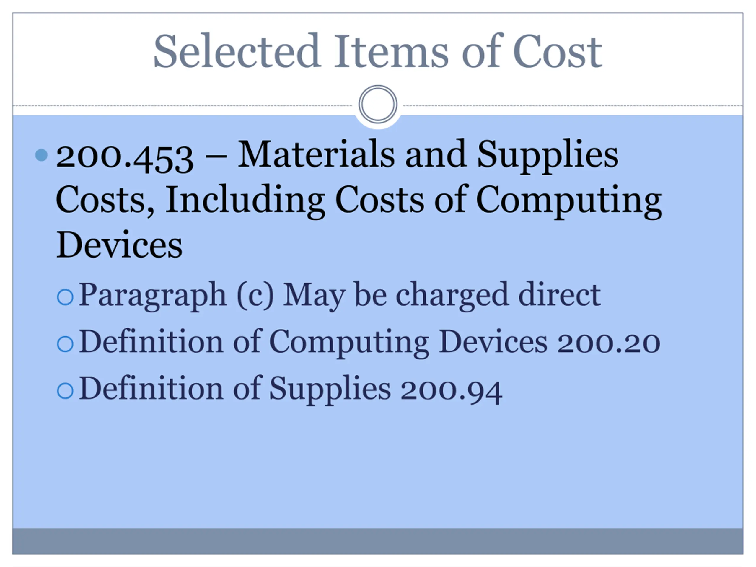 Selected Items of Cost 200.453 Materials and Supplies Costs, Including Costs of Computing Devices Paragraph (c) May be charged direct Definition of Computing Devices 200.20 Definition of Supplies 200.94