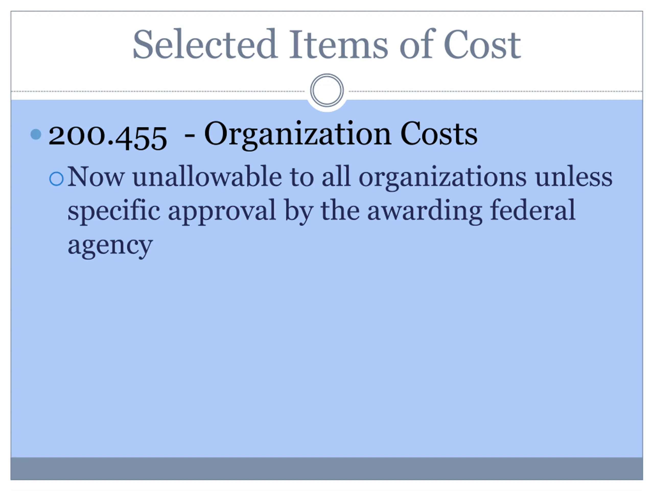 Selected Items of Cost 200.455 - Organization Costs Now unallowable to all organizations unless specific approval by the awarding federal agency
