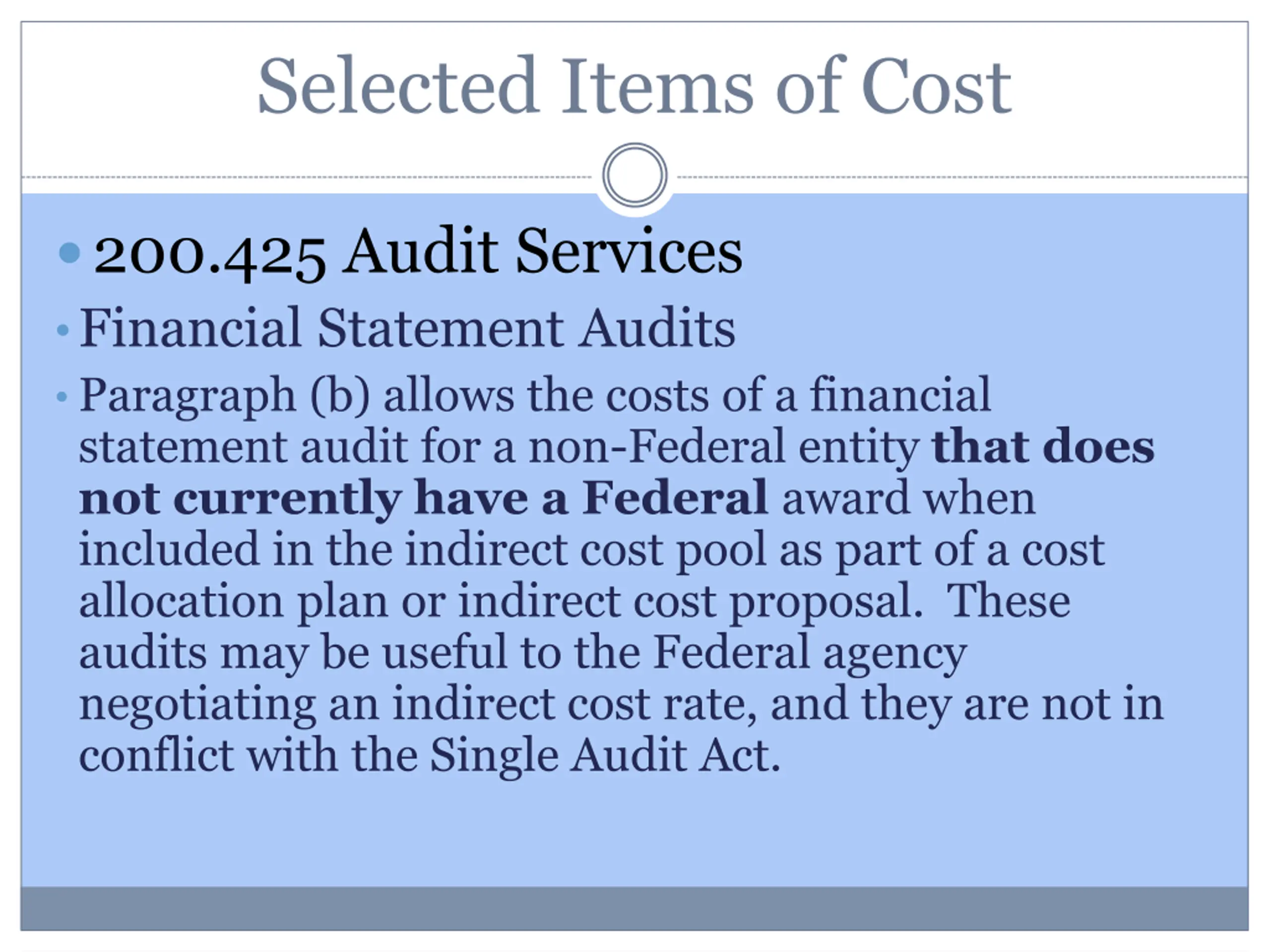 Selected Items of Cost 200.425 Audit Services Financial Statement Audits Paragraph (b) allows the costs of a financial statement audit for a non-Federal entity that does not currently have a Federal award when included in the indirect cost pool as part of a cost allocation plan or indirect cost proposal. These audits may be useful to the Federal agency negotiating an indirect cost rate, and they are not in conflict with the Single Audit Act.