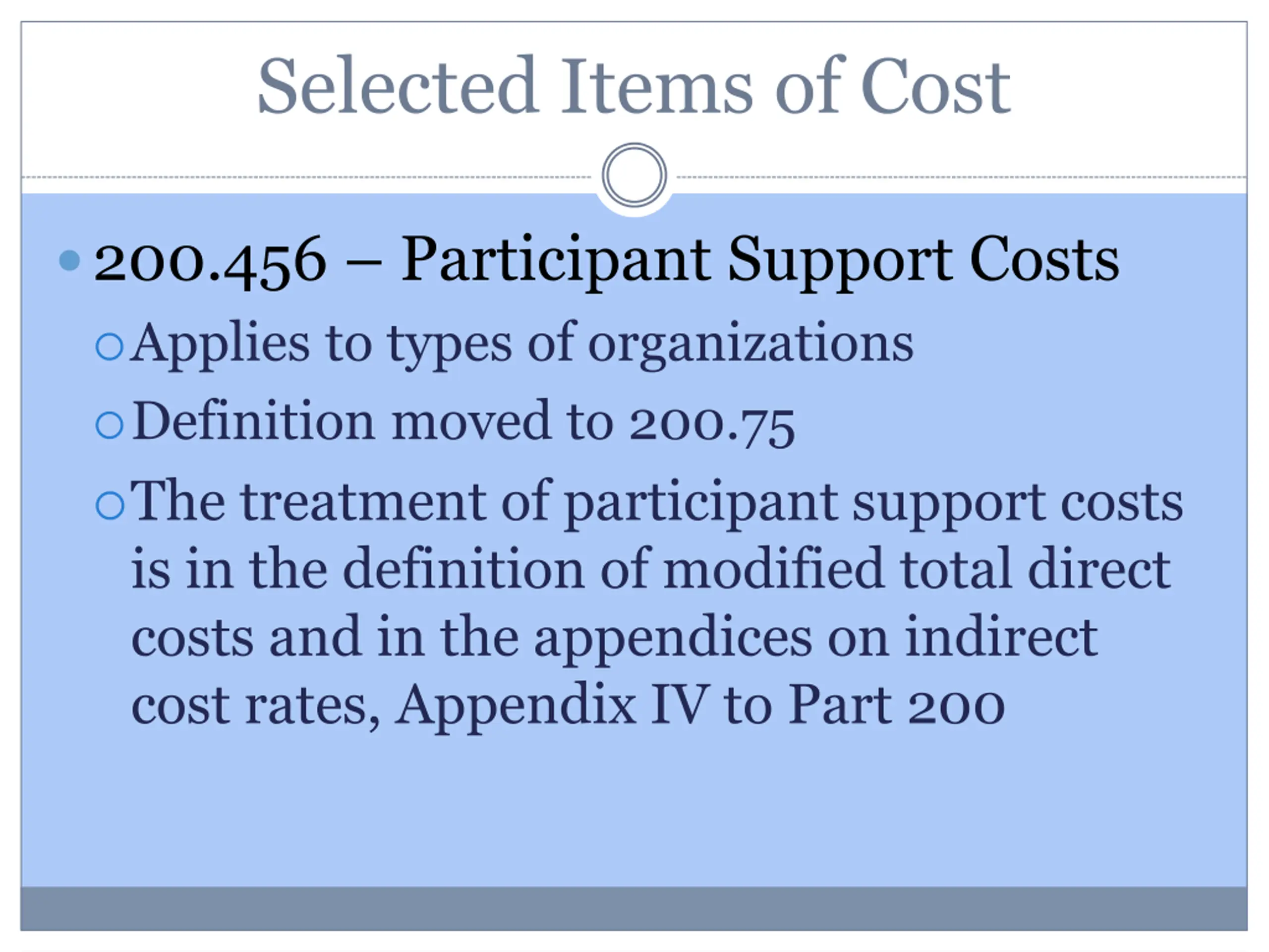 Selected Items of Cost 200.456 Participant Support Costs Applies to types of organizations Definition moved to 200.75 The treatment of participant support costs is in the definition of modified total direct costs and in the appendices on indirect cost rates, Appendix IV to Part 200