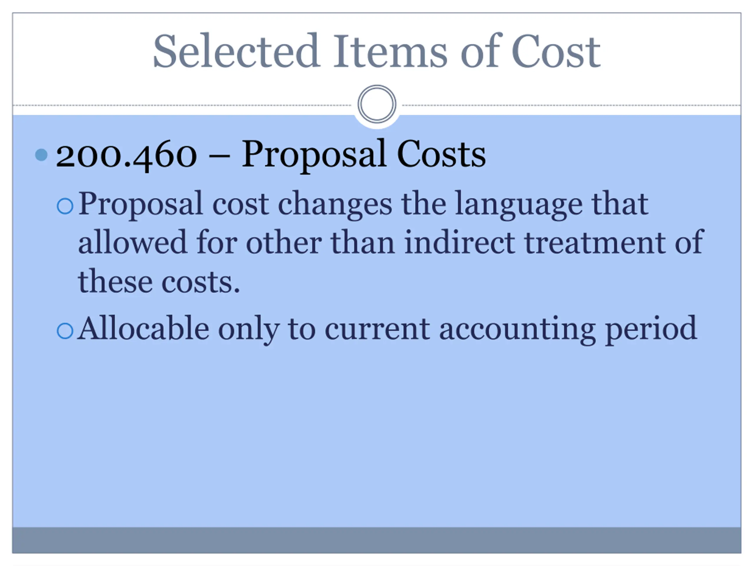 Selected Items of Cost 200.460 Proposal Costs Proposal cost changes the language that allowed for other than indirect treatment of these costs. Allocable only to current accounting period