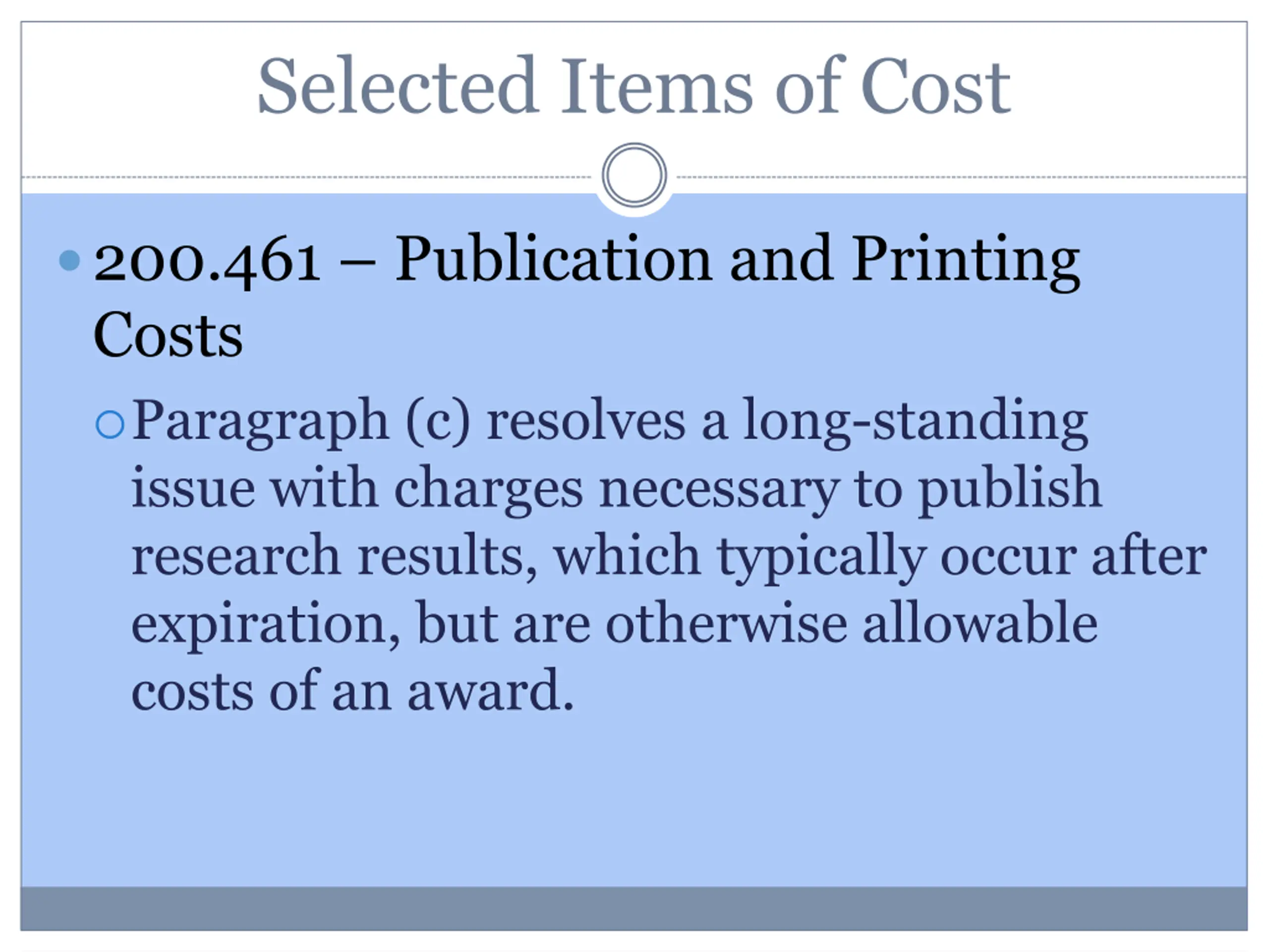 Selected Items of Cost 200.461 Publication and Printing Costs Paragraph (c) resolves a long-standing issue with charges necessary to publish research results, which typically occur after expiration, but are otherwise allowable costs of an award.