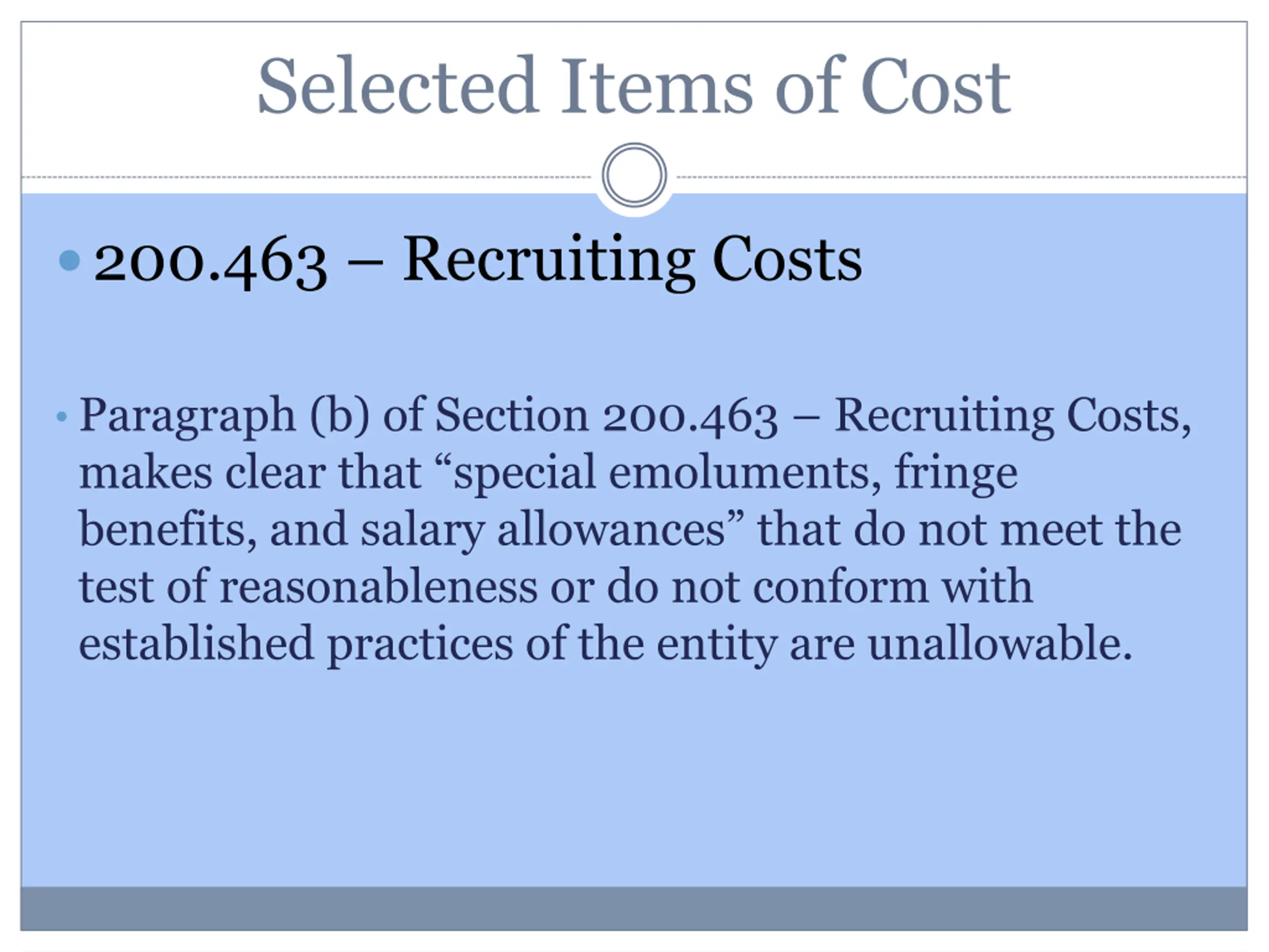 Selected Items of Cost 200.463 Recruiting Costs Paragraph (b) of Section 200.463 Recruiting Costs, makes clear that special emoluments, fringe benefits, and salary allowances that do not meet the test of reasonableness or do not conform with established practices of the entity are unallowable.