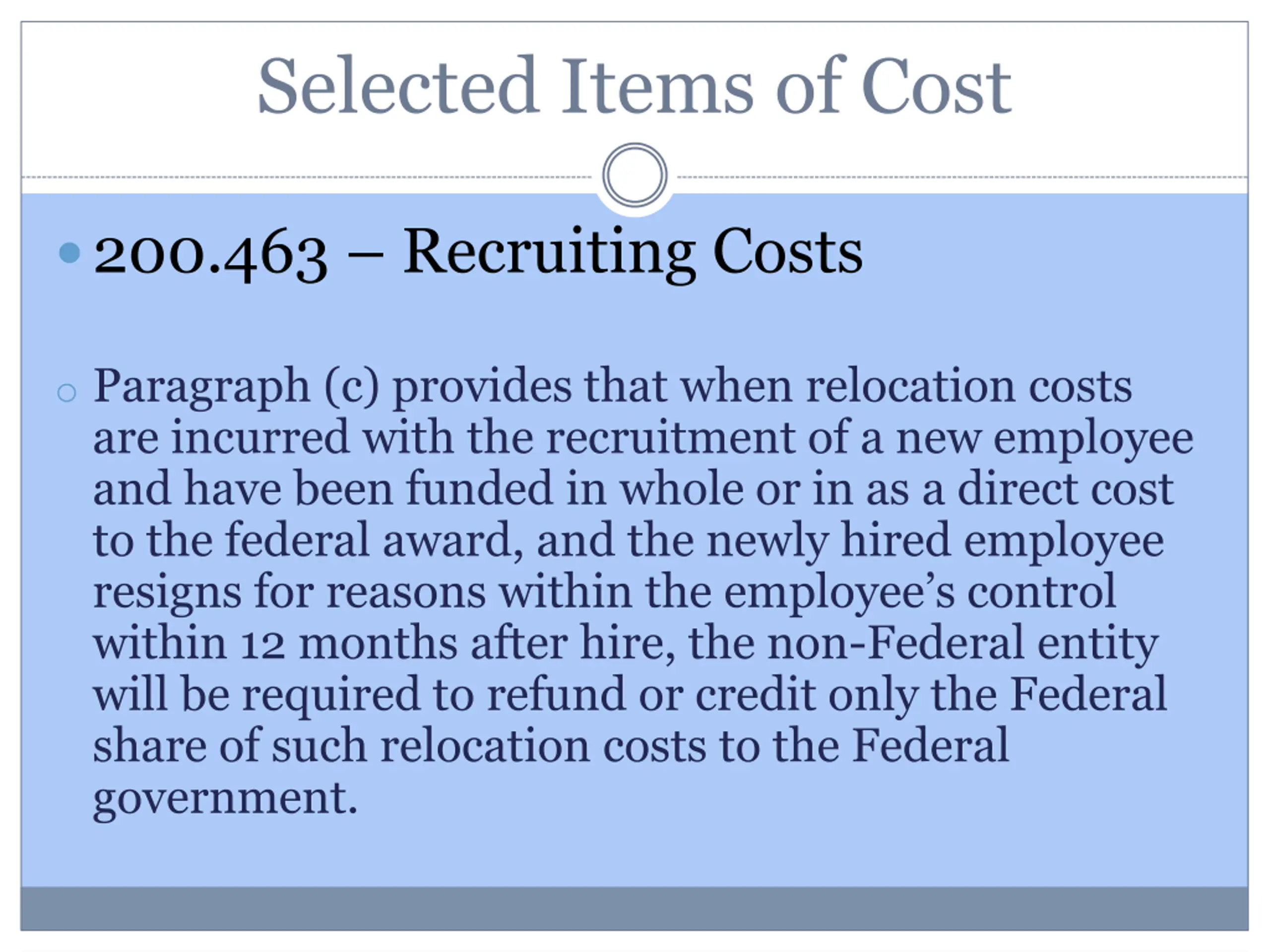 Selected Items of Cost 200.463 Recruiting Costs o Paragraph (c) provides that when relocation costs are incurred with the recruitment of a new employee and have been funded in whole or in as a direct cost to the federal award, and the newly hired employee resigns for reasons within the employee s control within 12 months after hire, the non-Federal entity will be required to refund or credit only the Federal share of such relocation costs to the Federal government.