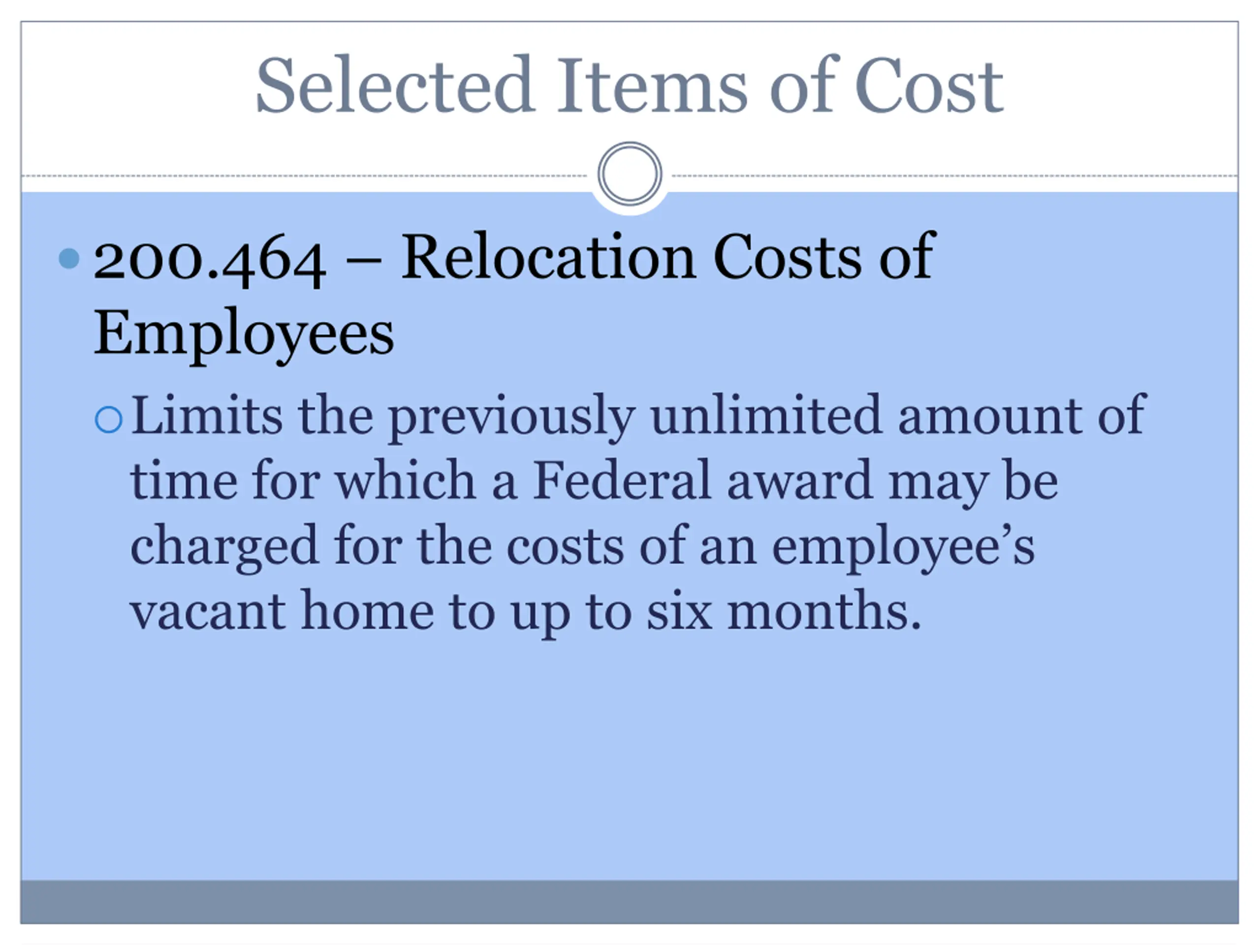 Selected Items of Cost 200.464 Relocation Costs of Employees Limits the previously unlimited amount of time for which a Federal award may be charged for the costs of an employee s vacant home to up to six months.