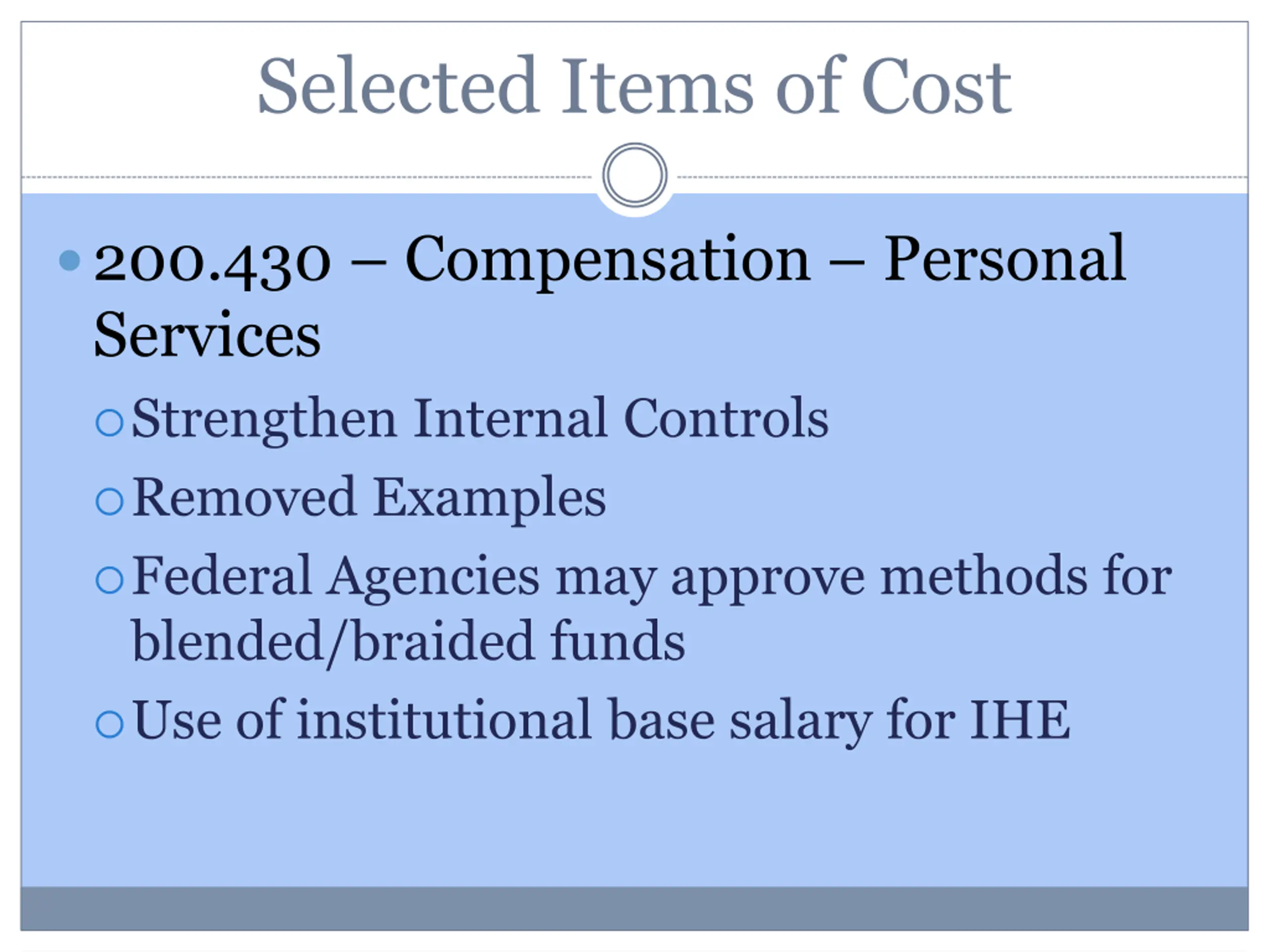 Selected Items of Cost 200.430 Compensation Personal Services Strengthen Internal Controls Removed Examples Federal Agencies may approve methods for blended/braided funds Use of institutional base salary for IHE