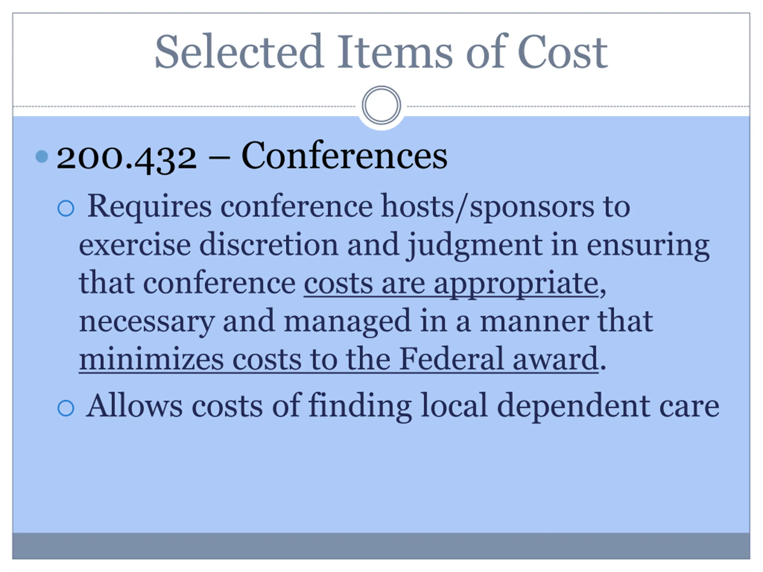 Selected Items of Cost 200.432 Conferences Requires conference hosts/sponsors to exercise discretion and judgment in ensuring that conference costs are appropriate, necessary and managed in a manner that minimizes costs to the Federal award. Allows costs of finding local dependent care