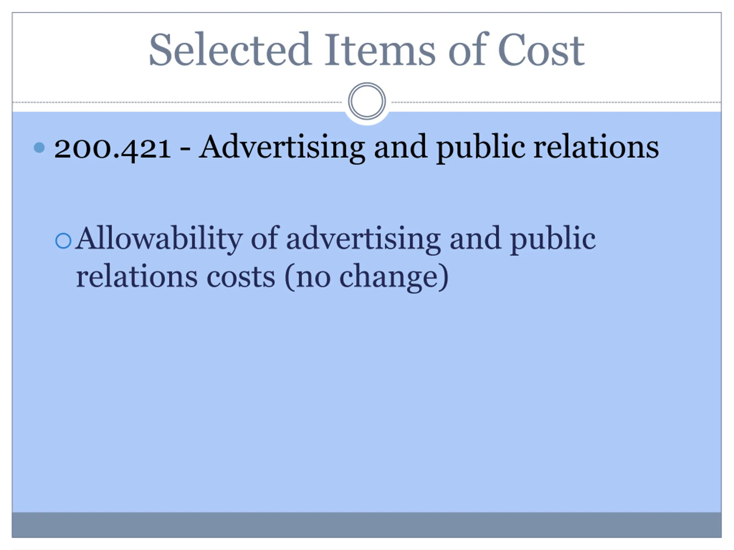 Selected Items of Cost 200.421 - Advertising and public relations Allowability of advertising and public relations costs (no change)