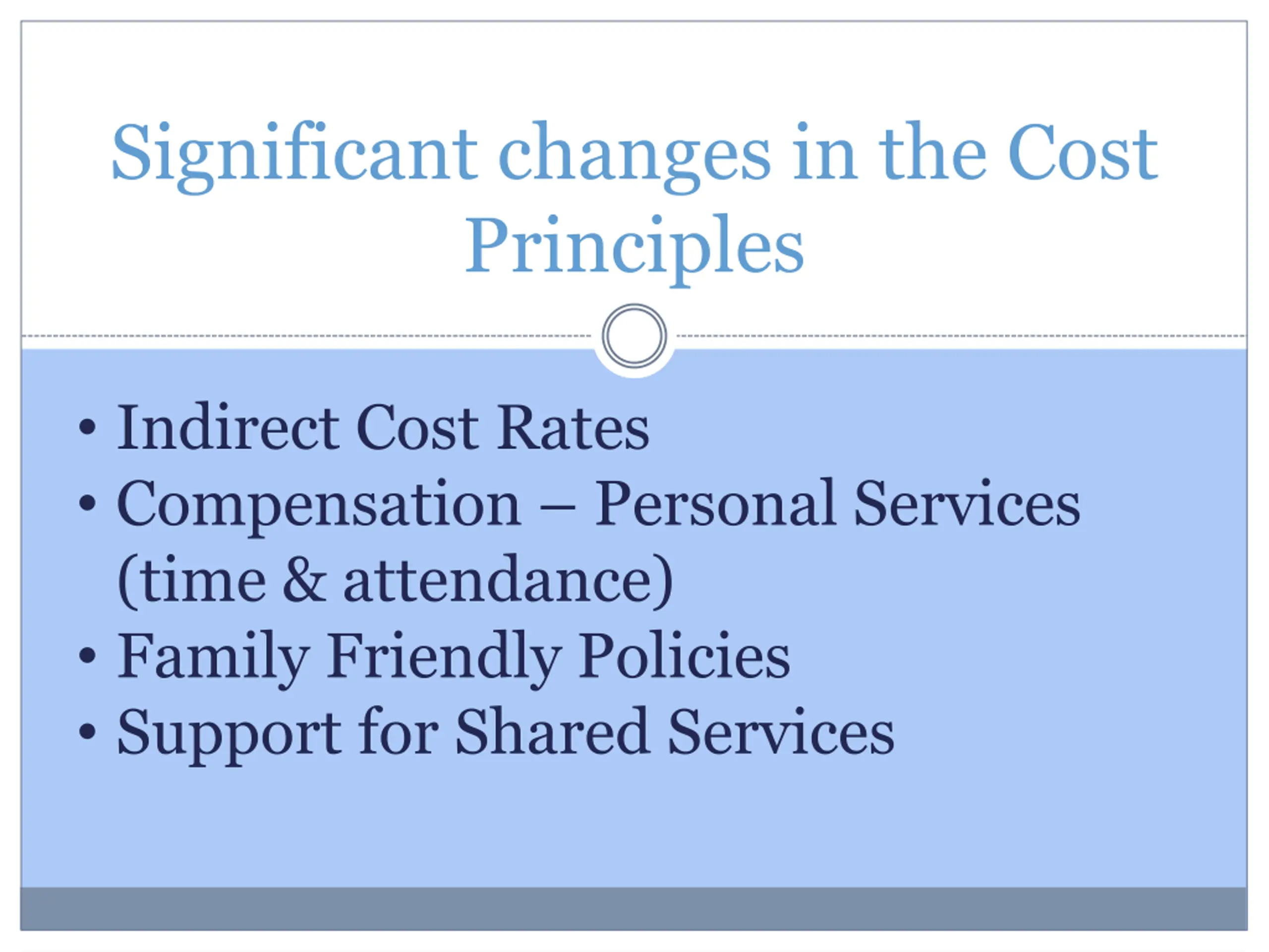 Significant changes in the Cost Principles Indirect Cost Rates Compensation Personal Services (time & attendance) Family Friendly Policies Support for Shared Services