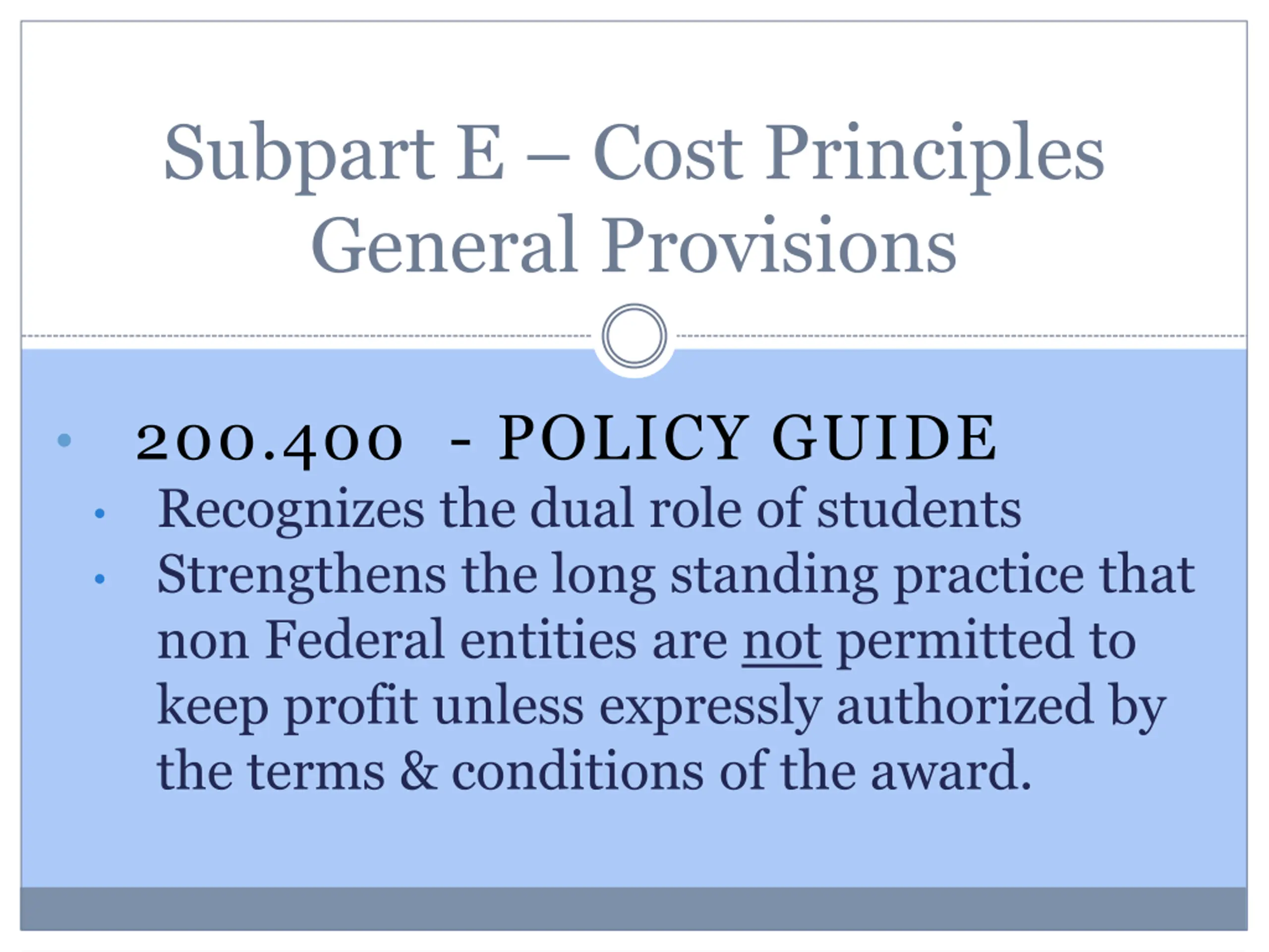 Subpart E Cost Principles General Provisions 200.400 - POLICY GUIDE Recognizes the dual role of students Strengthens the long standing practice that non Federal entities are not permitted to keep profit unless expressly authorized by the terms & conditions of the award.