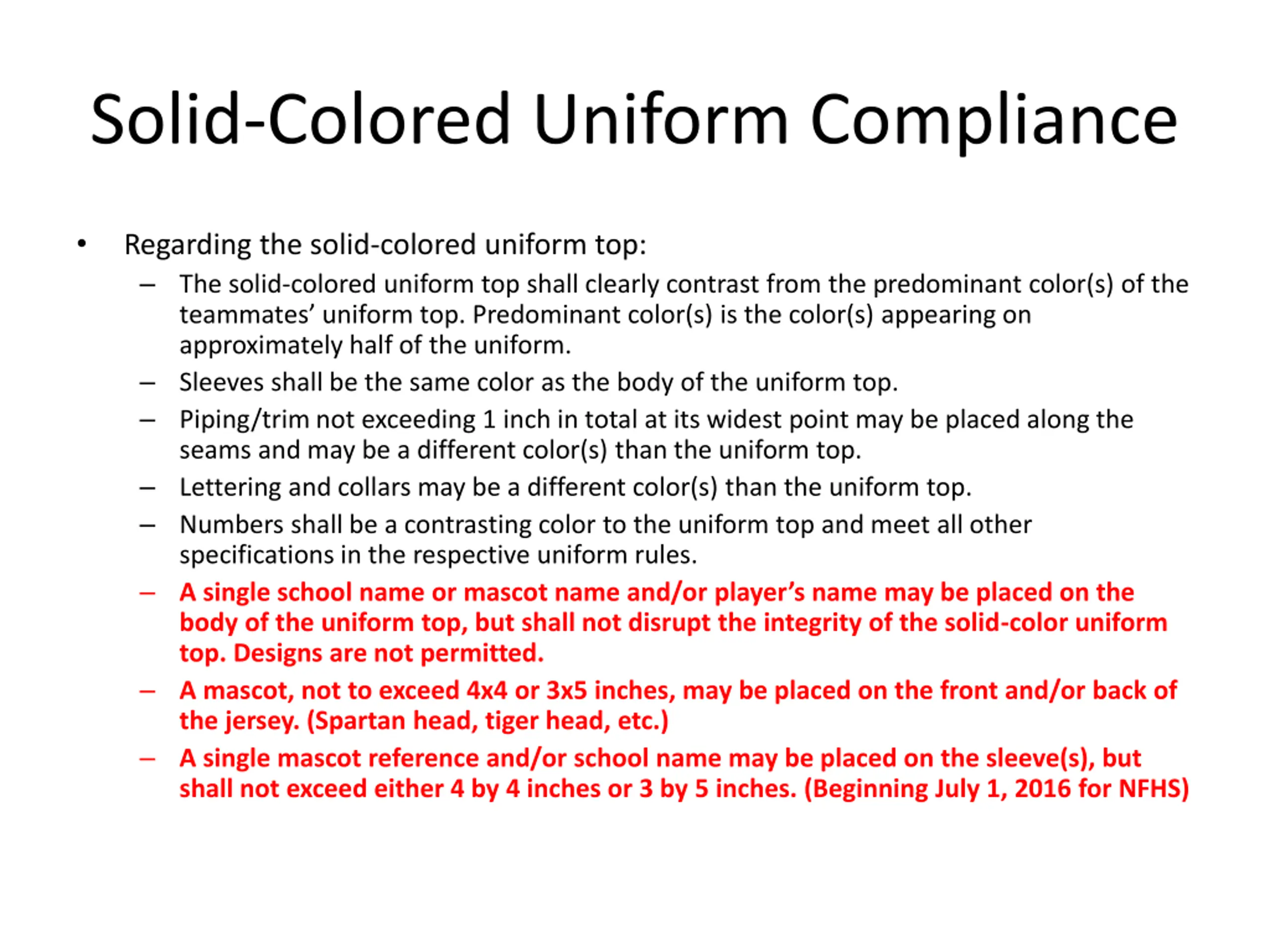 Solid-Colored Uniform Compliance Regarding the solid-colored uniform top: The solid-colored uniform top shall clearly contrast from the predominant color(s) of the teammates uniform top. Predominant color(s) is the color(s) appearing on approximately half of the uniform. Sleeves shall be the same color as the body of the uniform top. Piping/trim not exceeding 1 inch in total at its widest point may be placed along the seams and may be a different color(s) than the uniform top. Lettering and collars may be a different color(s) than the uniform top. Numbers shall be a contrasting color to the uniform top and meet all other specifications in the respective uniform rules. A single school name or mascot name and/or player s name may be placed on the body of the uniform top, but shall not disrupt the integrity of the solid-color uniform top. Designs are not permitted. A mascot, not to exceed 4x4 or 3x5 inches, may be placed on the front and/or back of the jersey. (Spartan head, tiger head, etc.) A single mascot reference and/or school name may be placed on the sleeve(s), but shall not exceed either 4 by 4 inches or 3 by 5 inches. (Beginning July 1, 2016 for NFHS)