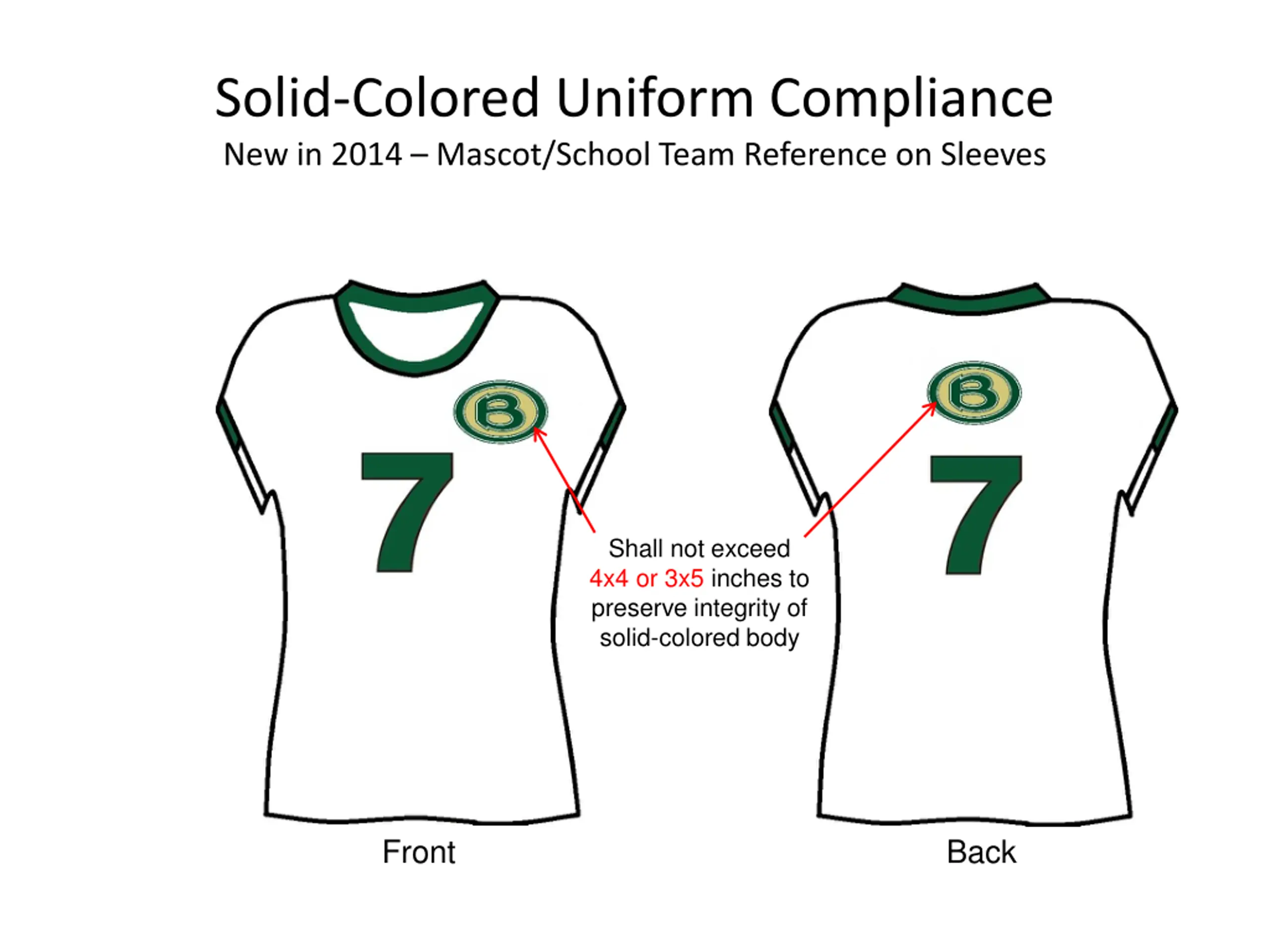 Solid-Colored Uniform Compliance New in 2014 Mascot/School Team Reference on Sleeves Shall not exceed 4x4 or 3x5 inches to preserve integrity of solid-colored body Front Back