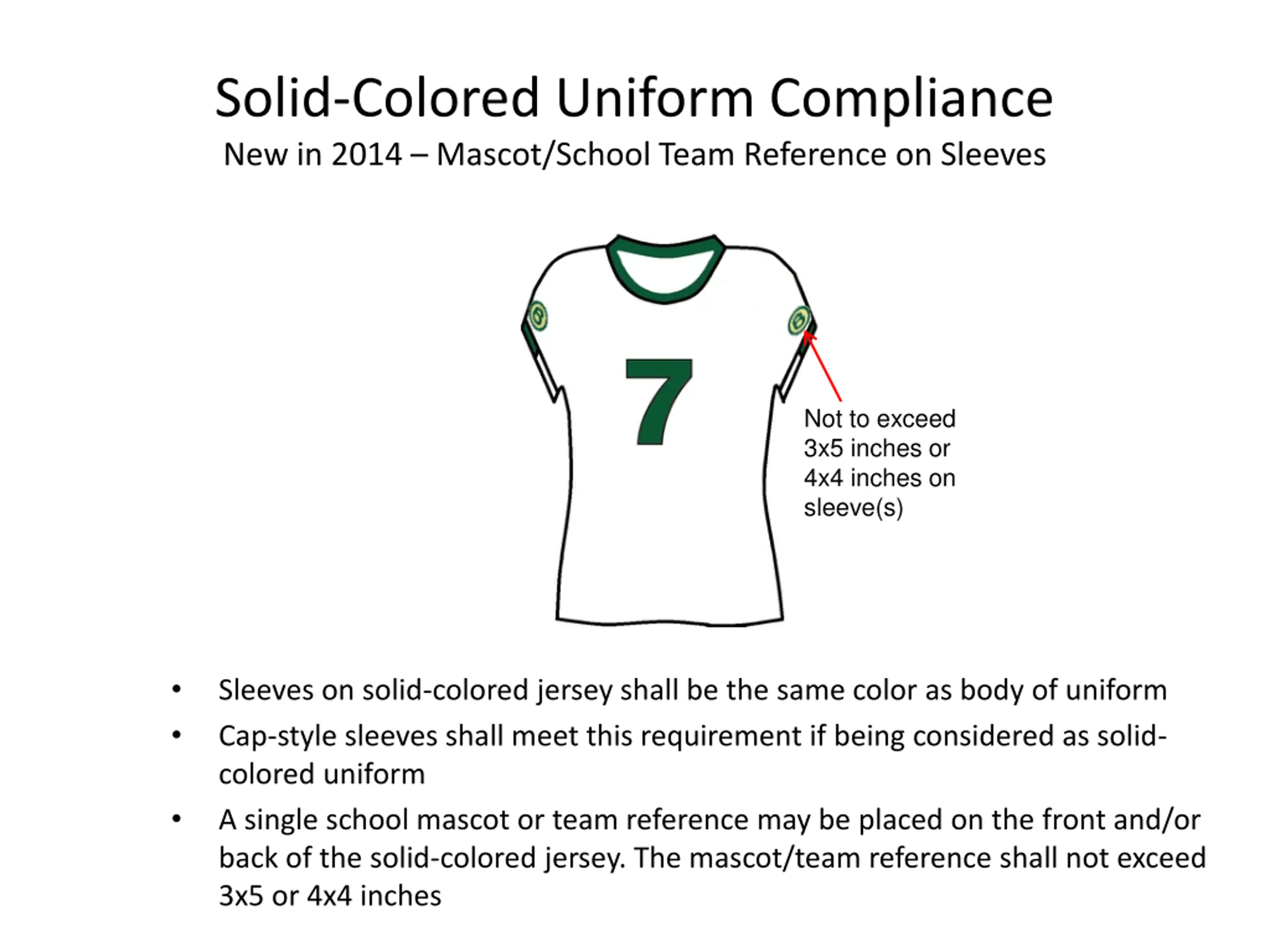Solid-Colored Uniform Compliance New in 2014 Mascot/School Team Reference on Sleeves Not to exceed 3x5 inches or 4x4 inches on sleeve(s) Sleeves on solid-colored jersey shall be the same color as body of uniform Cap-style sleeves shall meet this requirement if being considered as solid- colored uniform A single school mascot or team reference may be placed on the front and/or back of the solid-colored jersey. The mascot/team reference shall not exceed 3x5 or 4x4 inches