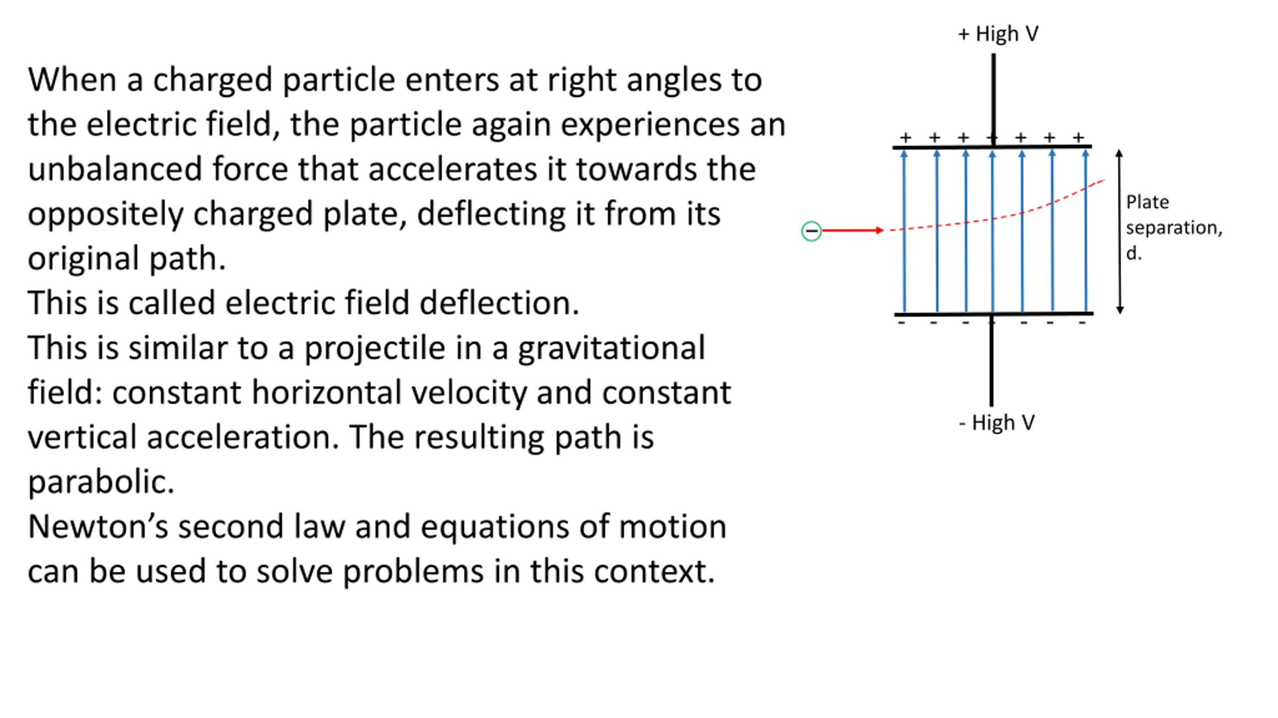 + High V When a charged particle enters at right angles to the electric field, the particle again experiences an unbalanced force that accelerates it towards the oppositely charged plate, deflecting it from its original path. This is called electric field deflection. This is similar to a projectile in a gravitational field: constant horizontal velocity and constant vertical acceleration. The resulting path is parabolic. Newton s second law and equations of motion can be used to solve problems in this context. + + + + + + + Plate separation, d. - - - - - - - - High V