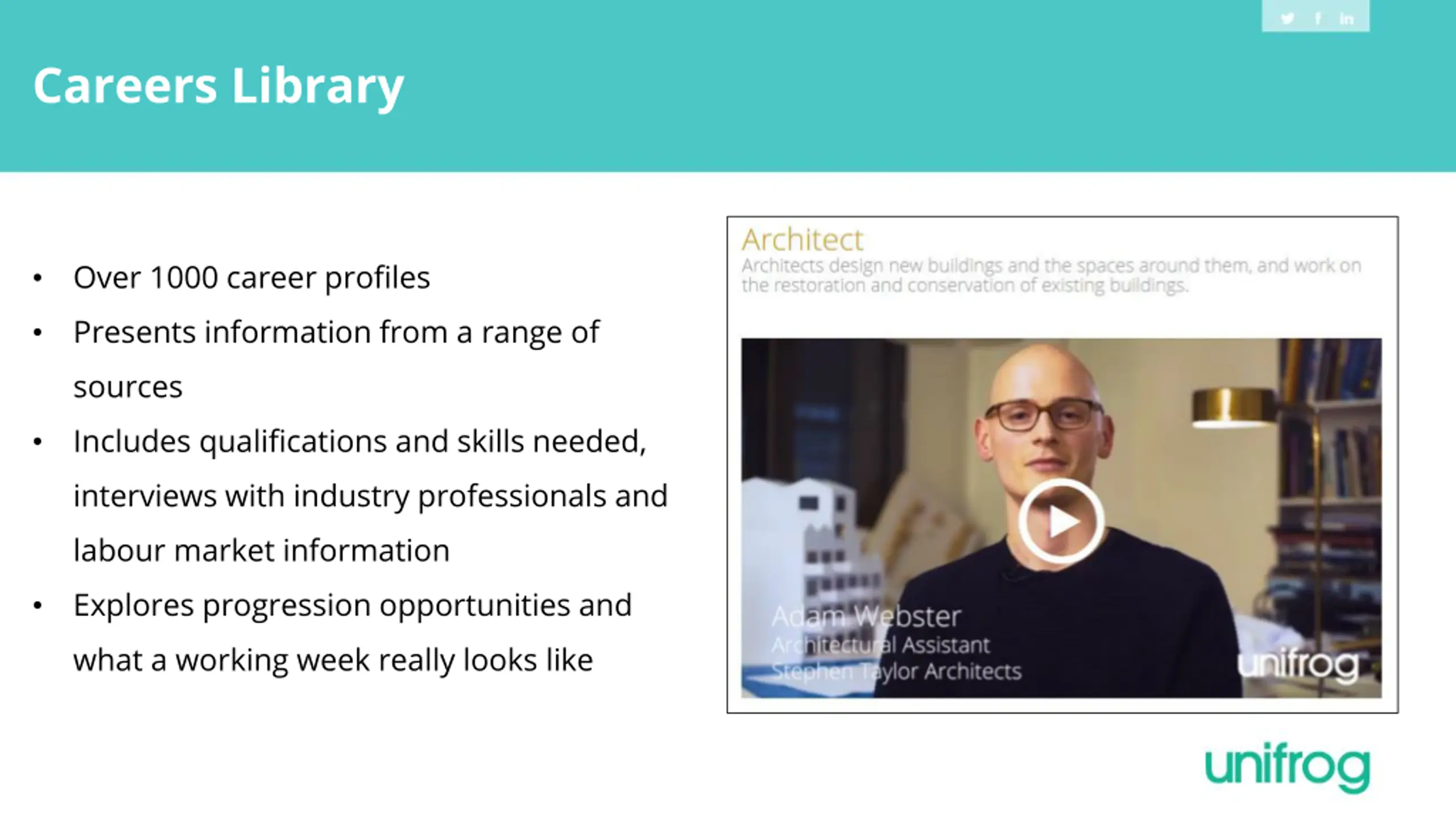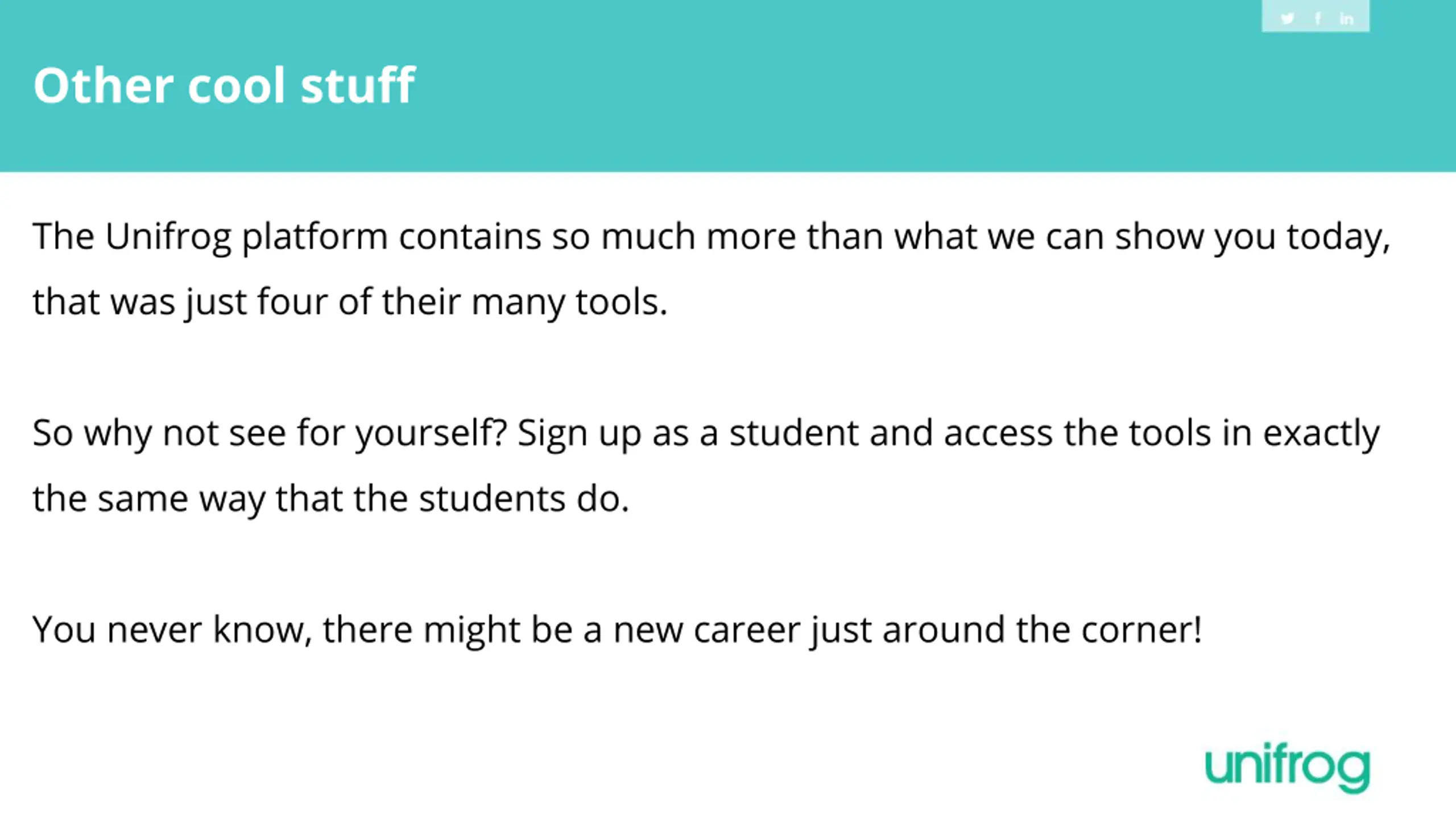 Other cool stuff The Unifrog platform contains so much more than what we can show you today, that was just four of their many tools. So why not see for yourself? Sign up as a student and access the tools in exactly the same way that the students do. You never know, there might be a new career just around the corner!