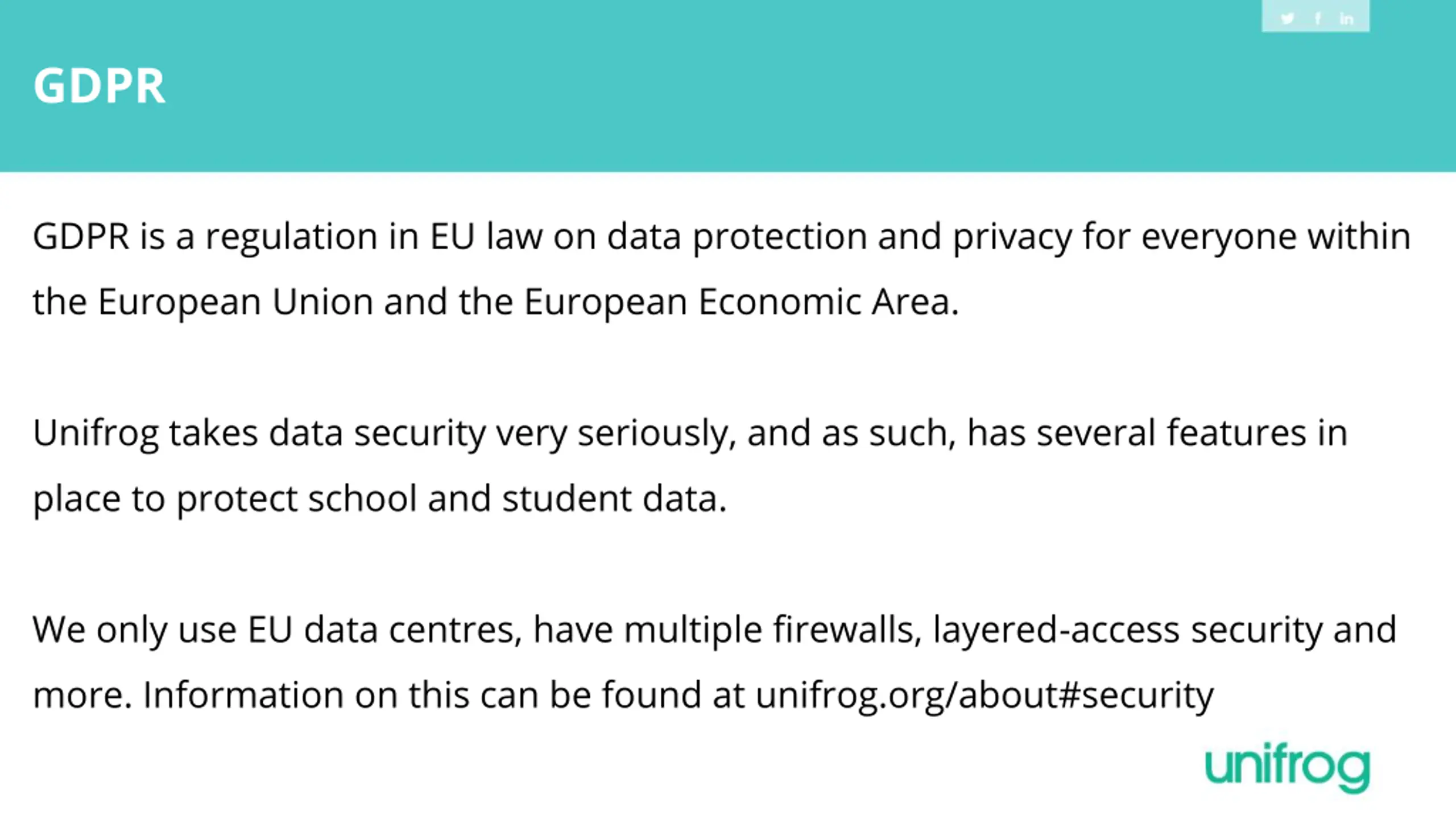 GDPR GDPR is a regulation in EU law on data protection and privacy for everyone within the European Union and the European Economic Area. Unifrog takes data security very seriously, and as such, has several features in place to protect school and student data. We only use EU data centres, have multiple firewalls, layered-access security and more. Information on this can be found at unifrog.org/about#security