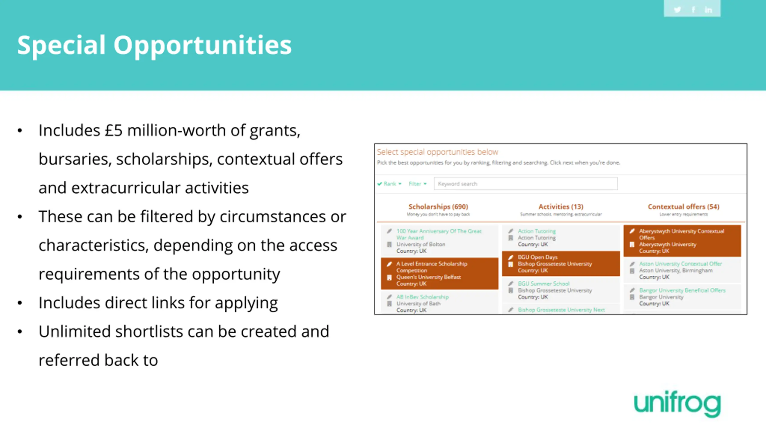 Special Opportunities Includes 5 million-worth of grants, bursaries, scholarships, contextual offers and extracurricular activities These can be filtered by circumstances or characteristics, depending on the access requirements of the opportunity Includes direct links for applying Unlimited shortlists can be created and referred back to