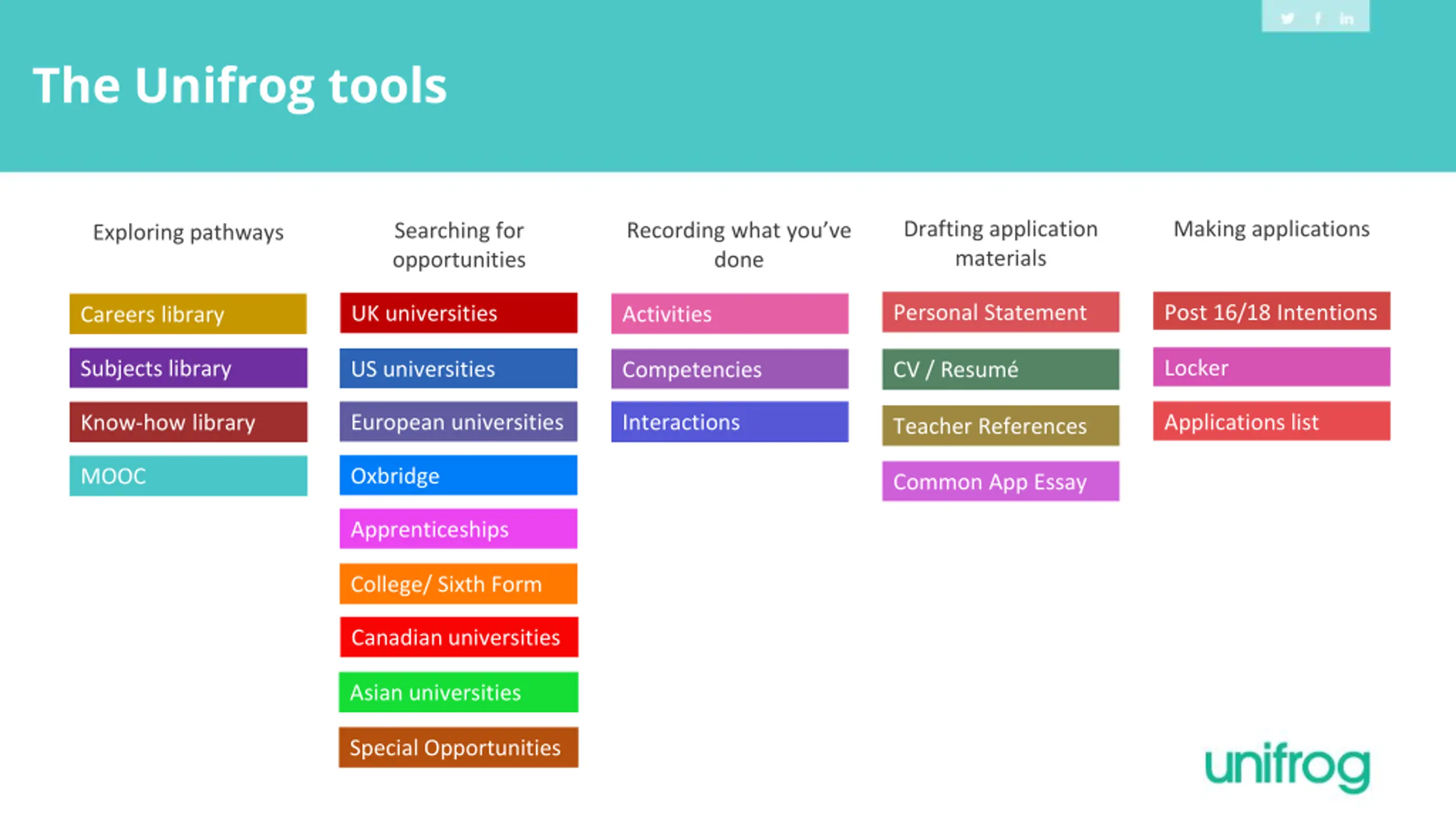 The Unifrog tools Drafting application materials Making applications Recording what you ve done Searching for opportunities Exploring pathways Personal Statement Post 16/18 Intentions UK universities Activities Careers library Locker Subjects library US universities Competencies CV / Resum Interactions Applications list European universities Know-how library Teacher References Oxbridge MOOC Common App Essay Apprenticeships College/ Sixth Form Canadian universities Asian universities Special Opportunities