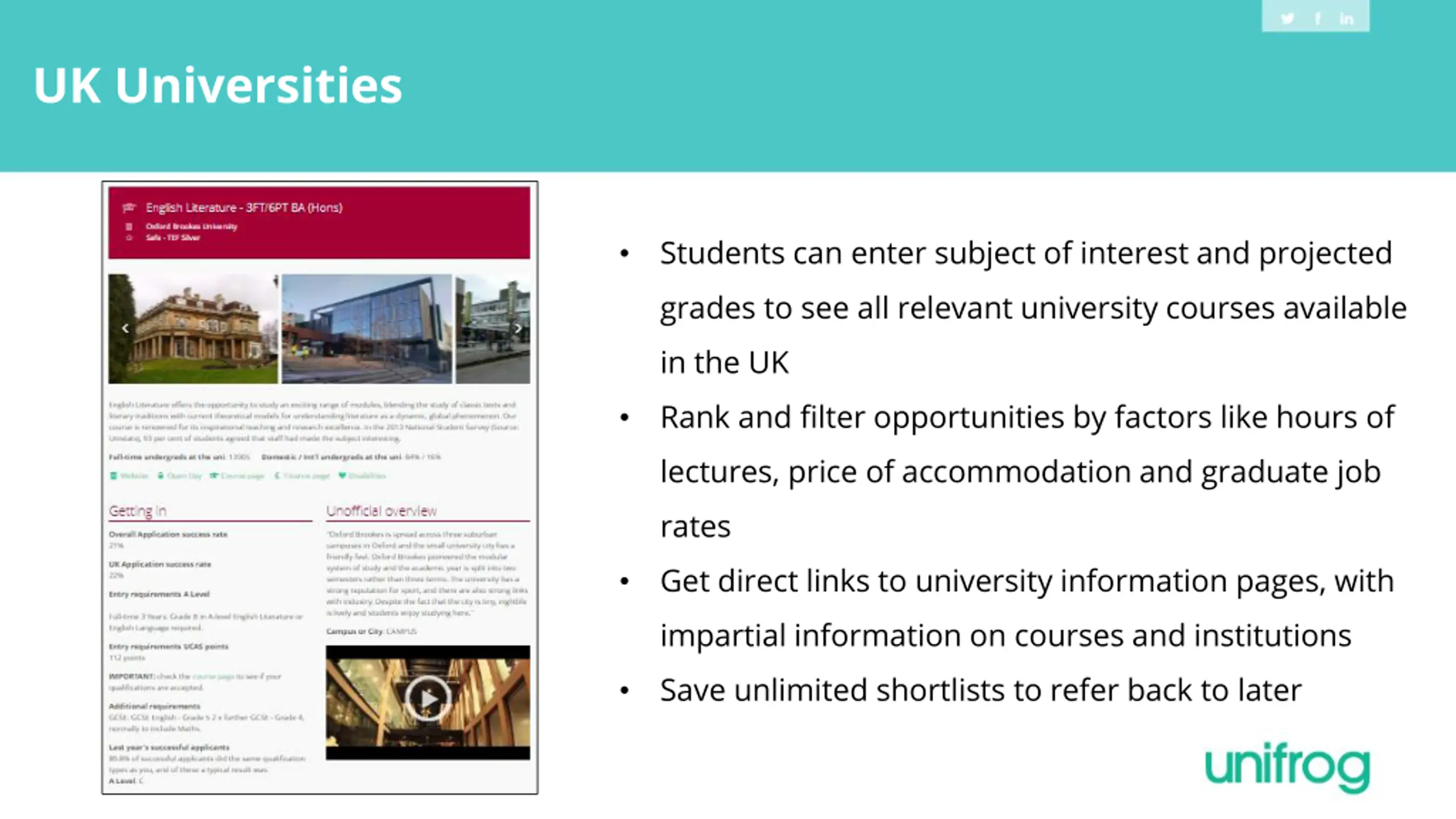 UK Universities Students can enter subject of interest and projected grades to see all relevant university courses available in the UK Rank and filter opportunities by factors like hours of lectures, price of accommodation and graduate job rates Get direct links to university information pages, with impartial information on courses and institutions Save unlimited shortlists to refer back to later