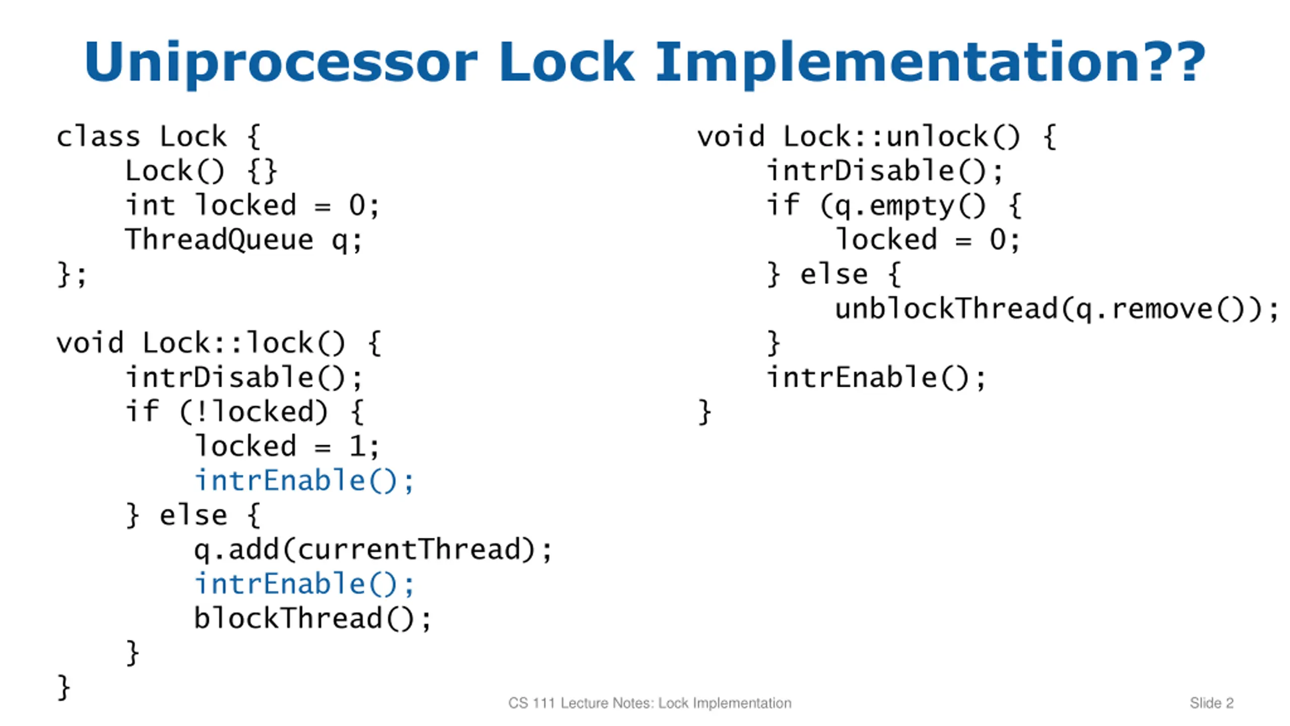Uniprocessor Lock Implementation?? class Lock { Lock() {} int locked = 0; ThreadQueue q; }; void Lock::unlock() { intrDisable(); if (q.empty() { locked = 0; } else { unblockThread(q.remove()); } intrEnable(); } void Lock::lock() { intrDisable(); if (!locked) { locked = 1; intrEnable(); } else { q.add(currentThread); intrEnable(); blockThread(); } } CS 111 Lecture Notes: Lock Implementation Slide 2