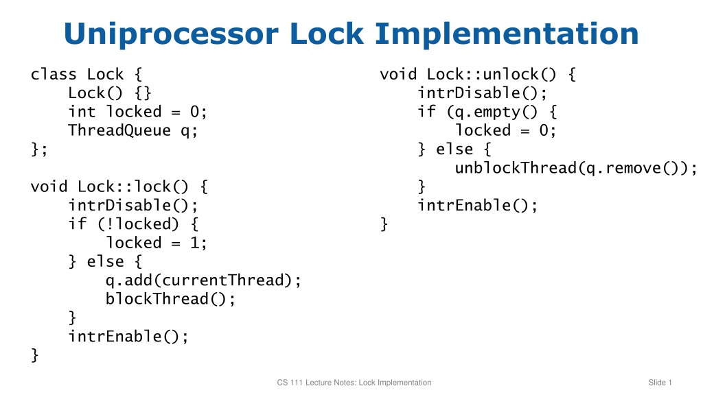 Uniprocessor Lock Implementation class Lock { Lock() {} int locked = 0; ThreadQueue q; }; void Lock::unlock() { intrDisable(); if (q.empty() { locked = 0; } else { unblockThread(q.remove()); } intrEnable(); } void Lock::lock() { intrDisable(); if (!locked) { locked = 1; } else { q.add(currentThread); blockThread(); } intrEnable(); } CS 111 Lecture Notes: Lock Implementation Slide 1