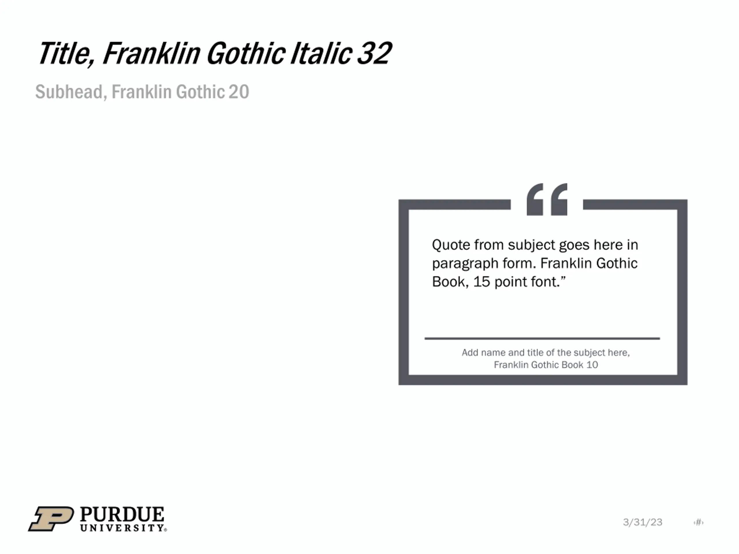 Title, Franklin Gothic Italic 32 Subhead, Franklin Gothic 20 Quote from subject goes here in paragraph form. Franklin Gothic Book, 15 point font. Add name and title of the subject here, Franklin Gothic Book 10 3/31/23 #