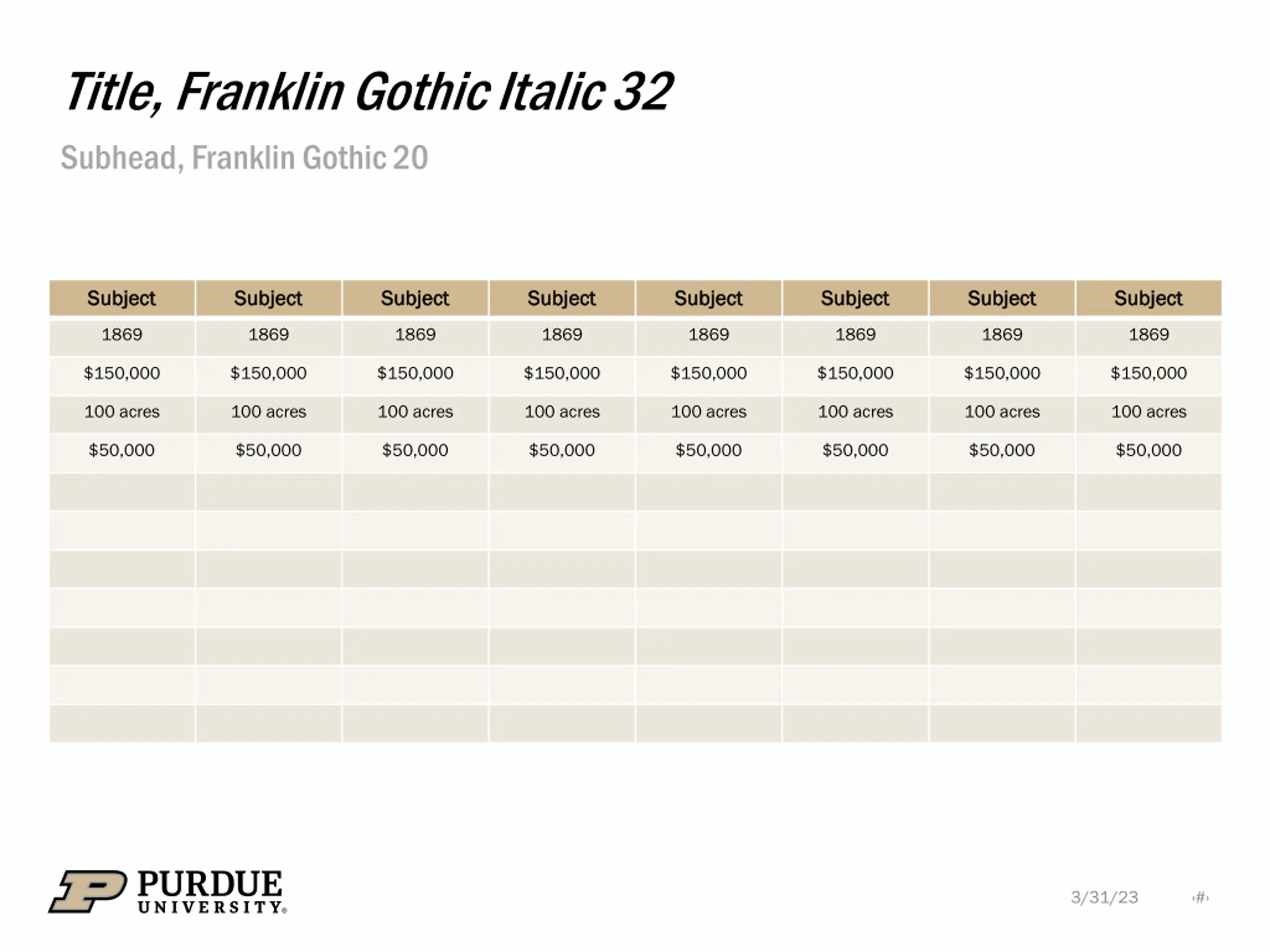 Title, Franklin Gothic Italic 32 Subhead, Franklin Gothic 20 Subject Subject Subject Subject Subject Subject Subject Subject Subject Subject Subject Subject Subject Subject Subject Subject 1869 1869 1869 1869 1869 1869 1869 1869 $150,000 $150,000 $150,000 $150,000 $150,000 $150,000 $150,000 $150,000 100 acres 100 acres 100 acres 100 acres 100 acres 100 acres 100 acres 100 acres $50,000 $50,000 $50,000 $50,000 $50,000 $50,000 $50,000 $50,000 3/31/23 #