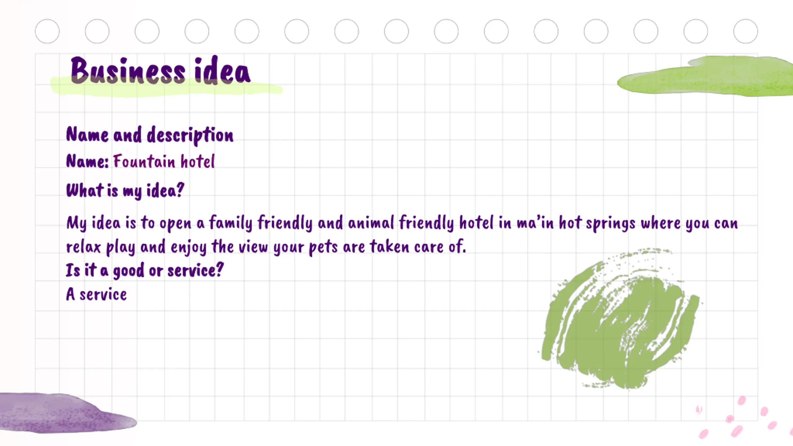 Business idea Business idea Name and des Name and description Name: Name:Fountain hotel What is my idea? What is my idea? My idea is to open a family friendly and animal friendly hotel in ma in hot springs where you can relax play and enjoy the view your pets are taken care of. Is it a good or service? Is it a good or service? A service cription