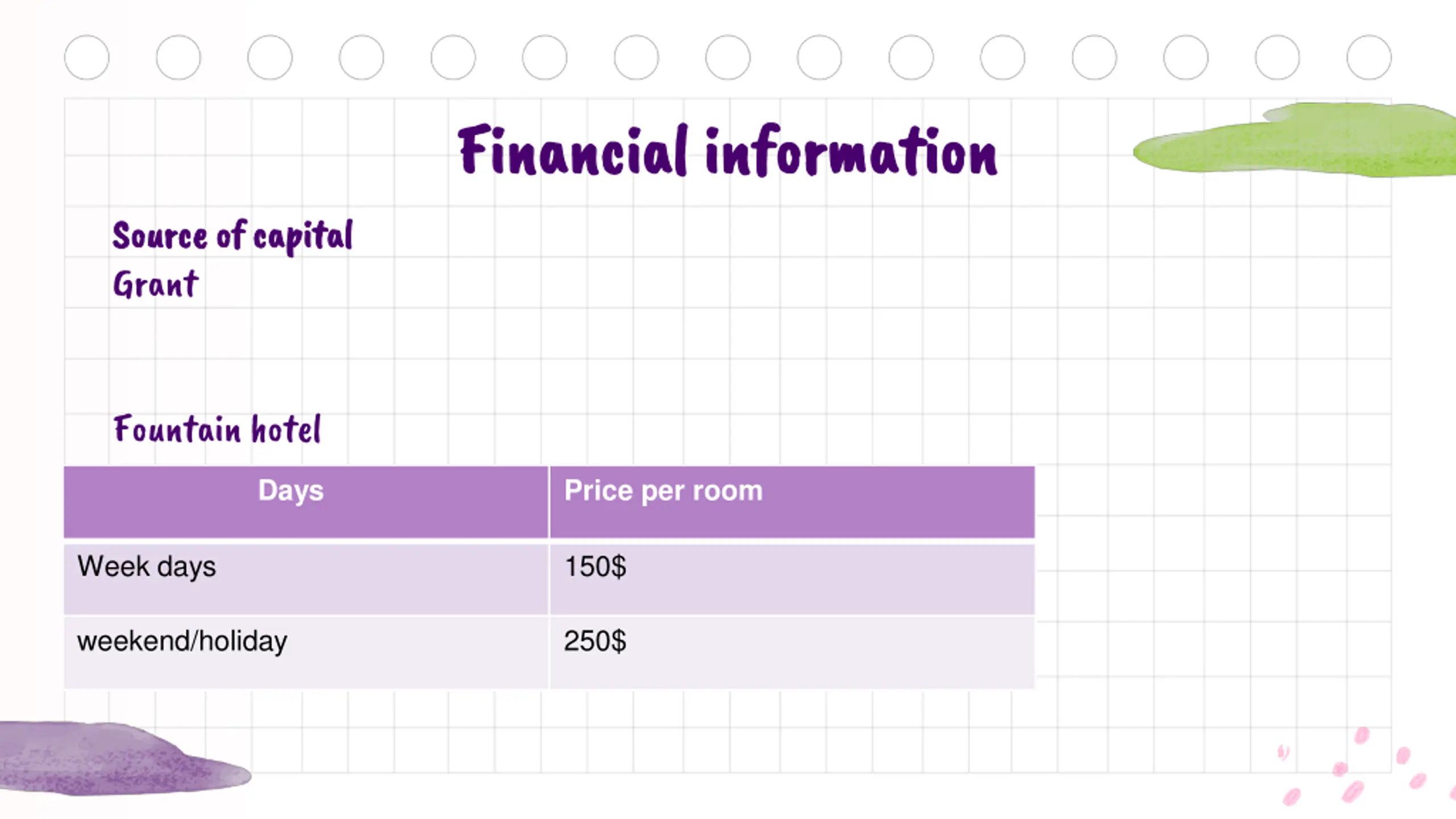 Financial information Financial information Source of capital Source of capital Grant Fountain hotel Days Price per room Week days 150$ weekend/holiday 250$