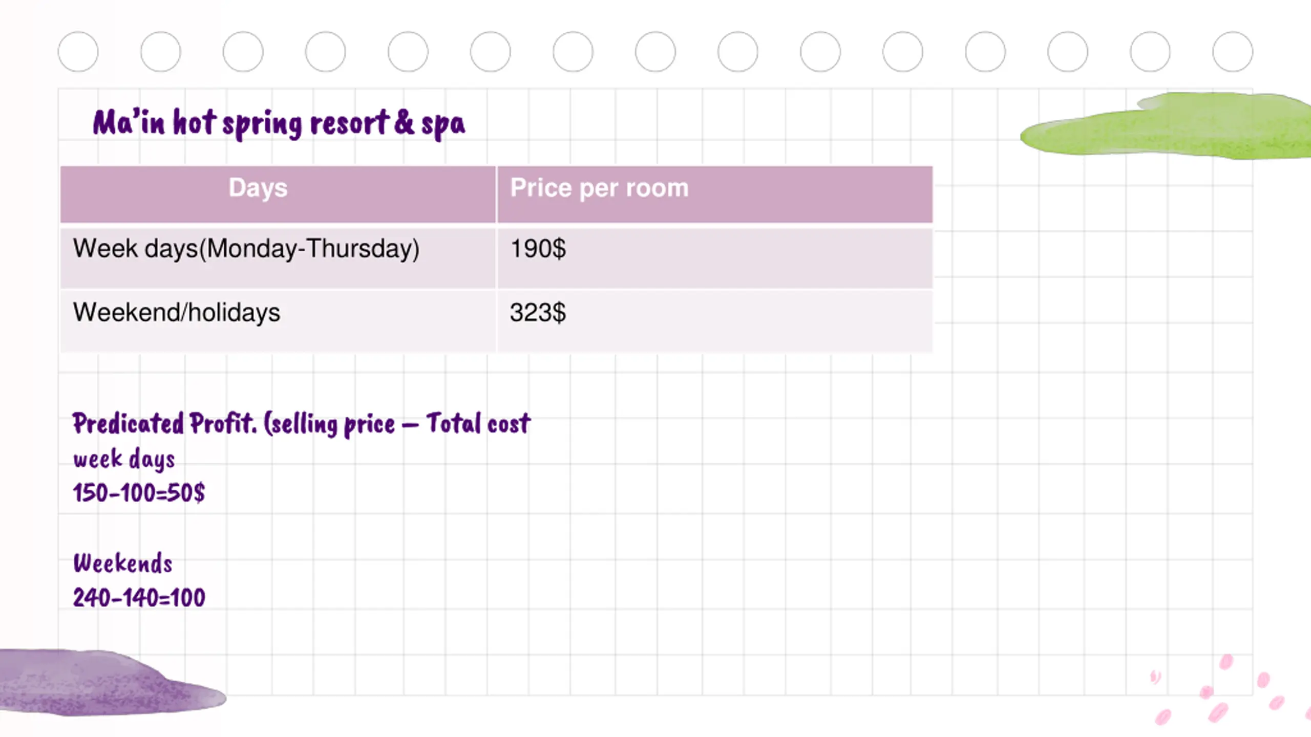 Main Ma inhot spring resort & spa hot spring resort & spa Days Price per room Week days(Monday-Thursday) 190$ Weekend/holidays 323$ Predicated Profit. (selling price Predicated Profit. (selling price Total week days 150-100=50$ Total cost cost Weekends 240-140=100