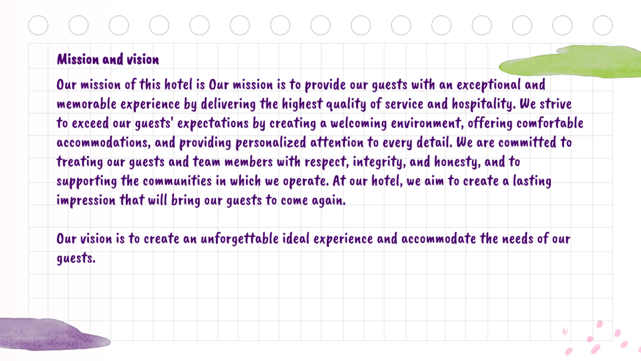 Mission and vision Mission and vision Our mission of this hotel is Our mission is to provide our guests with an exceptional and memorable experience by delivering the highest quality of service and hospitality. We strive to exceed our guests' expectations by creating a welcoming environment, offering comfortable accommodations, and providing personalized attention to every detail. We are committed to treating our guests and team members with respect, integrity, and honesty, and to supporting the communities in which we operate. At our hotel, we aim to create a lasting impression that will bring our guests to come again. Our vision is to create an unforgettable ideal experience and accommodate the needs of our guests.