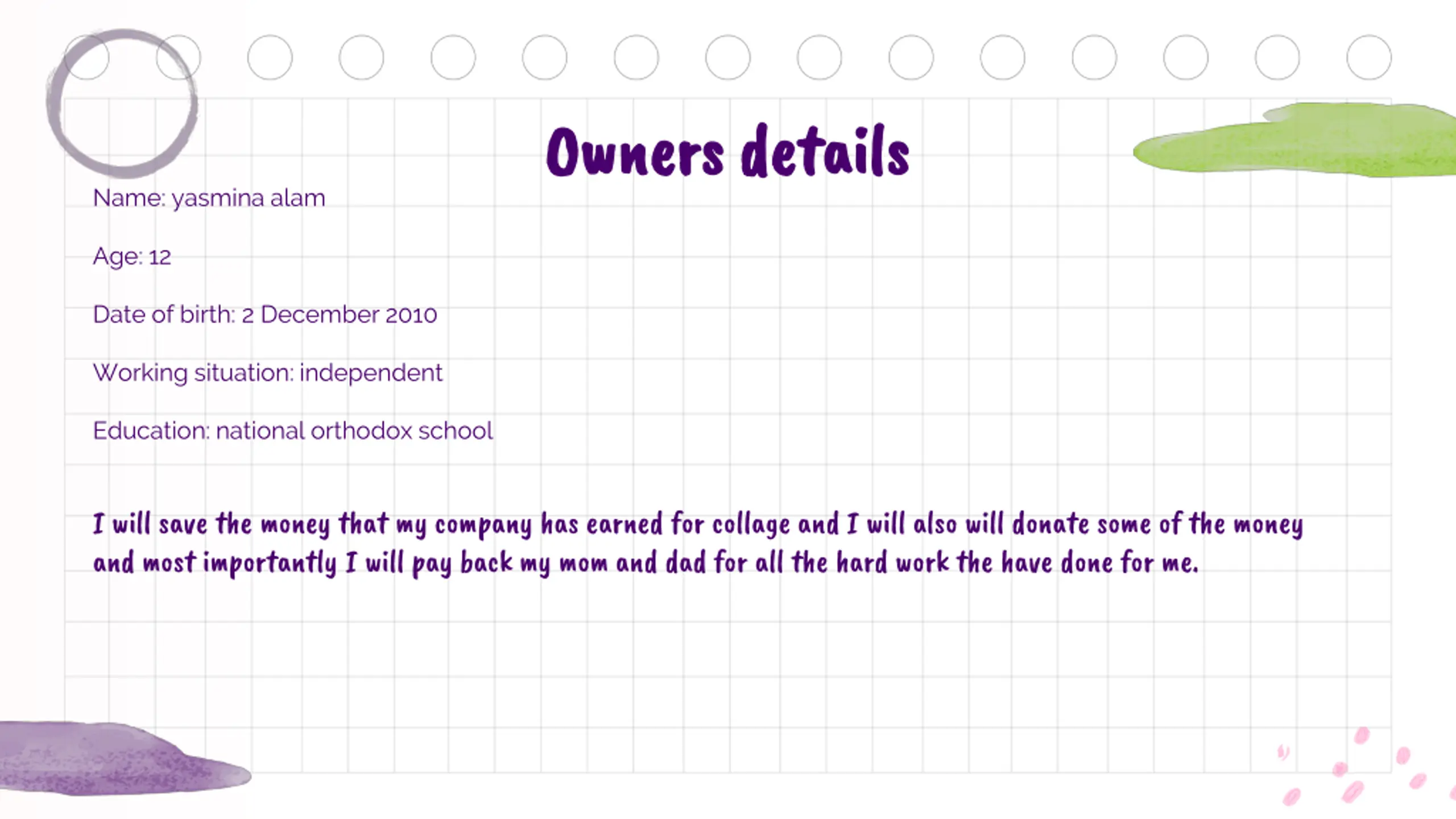 Owners details Owners details Name: yasmina alam Age: 12 Date of birth: 2 December 2010 Working situation: independent Education: national orthodox school I will save the money that my company has earned for collage and I will also will donate some of the money and most importantly I will pay back my mom and dad for all the hard work the have done for me.