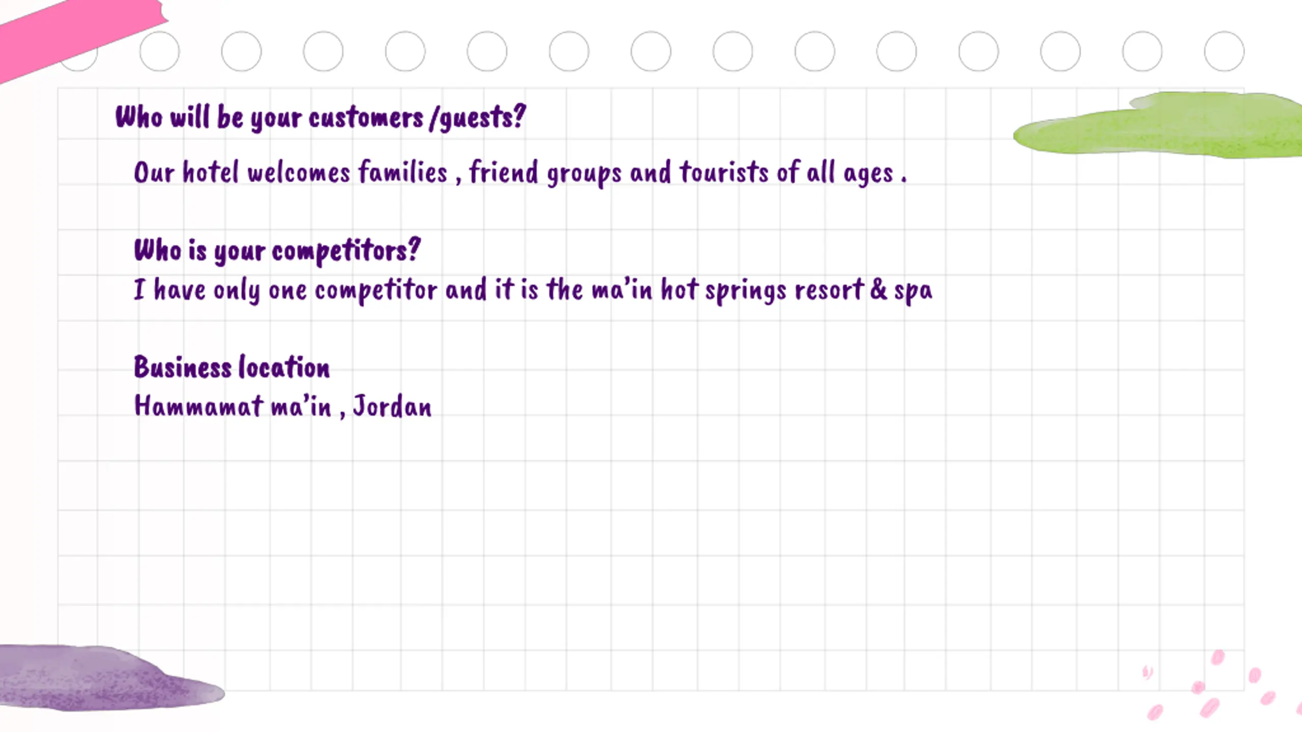 Who will be your customers /guests? Who will be your customers /guests? Our hotel welcomes families , friend groups and tourists of all ages . Who is your competitors Who is your competitors? ? I have only one competitor and it is the ma in hot springs resort & spa Business location Business location Hammamat ma in , Jordan