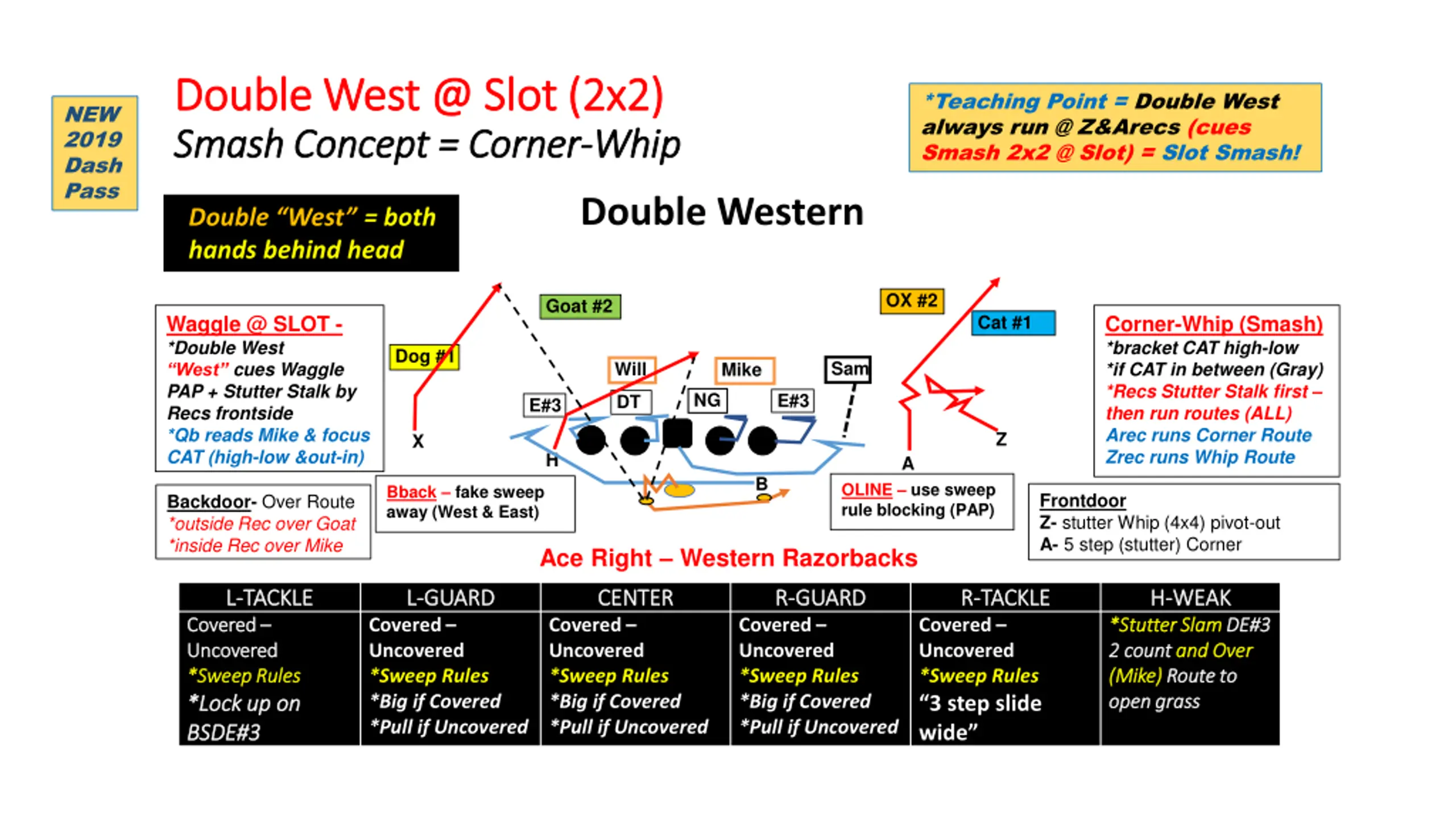 Double West @ Slot (2x2) Double West @ Slot (2x2) Smash Concept = Corner Smash Concept = Corner- -Whip *Teaching Point = Double West always run @ Z&Arecs (cues Smash 2x2 @ Slot) = Slot Smash! NEW 2019 Dash Pass Whip Double Western Double West = both hands behind head OX #2 Goat #2 Waggle @ SLOT - *Double West West cues Waggle PAP + Stutter Stalk by Recs frontside *Qb reads Mike & focus CAT (high-low &out-in) Corner-Whip (Smash) *bracket CAT high-low *if CAT in between (Gray) *Recs Stutter Stalk first then run routes (ALL) Arec runs Corner Route Zrec runs Whip Route Cat #1 Dog #1 Sam Will Mike NG E#3 DT E#3 Z X H A B OLINE use sweep rule blocking (PAP) Bback fake sweep away (West & East) Frontdoor Z- stutter Whip (4x4) pivot-out A- 5 step (stutter) Corner Backdoor- Over Route *outside Rec over Goat *inside Rec over Mike Ace Right Western Razorbacks L L- -TACKLE TACKLE Covered Covered Uncovered Uncovered *Sweep *Sweep Rules *Lock up on *Lock up on BSDE#3 BSDE#3 L L- -GUARD GUARD Covered Uncovered *Sweep Rules *Big if Covered *Pull if Uncovered CENTER CENTER R R- -GUARD GUARD Covered Uncovered *Sweep Rules *Big if Covered *Pull if Uncovered R R- -TACKLE TACKLE Covered Uncovered *Sweep Rules 3 step slide wide H H- -WEAK WEAK *Stutter *Stutter Slam 2 count 2 count and Over and Over (Mike) (Mike) Route to Route to open grass open grass Covered Uncovered *Sweep Rules *Big if Covered *Pull if Uncovered Slam DE#3 DE#3 Rules