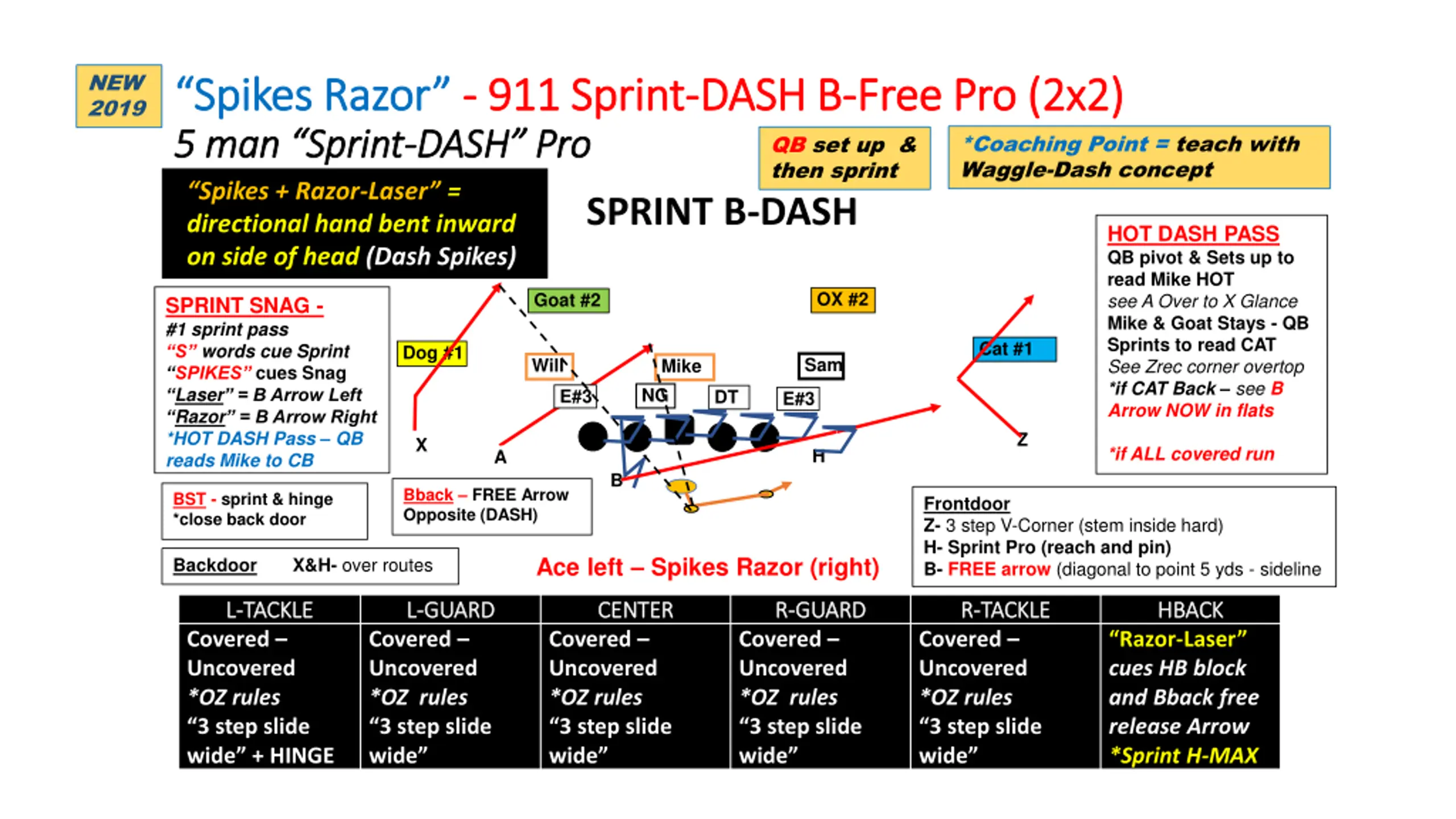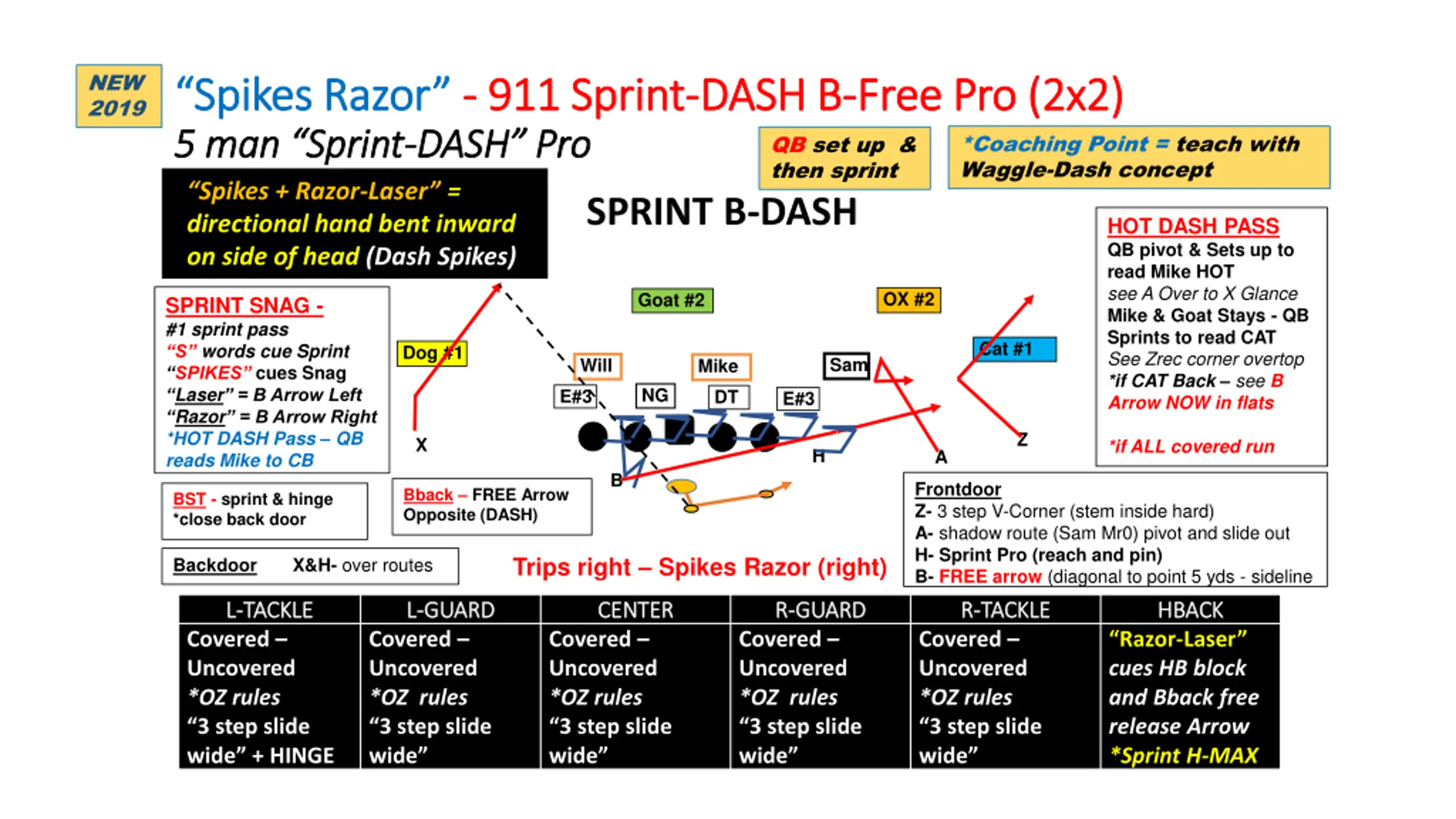 NEW 2019 Spikes Razor Spikes Razor - - 911 Sprint 5 man Sprint 5 man Sprint- -DASH Pro DASH Pro Spikes + Razor-Laser = directional hand bent inward on side of head (Dash Spikes) 911 Sprint- -DASH B DASH B- -Free Pro (2x2) Free Pro (2x2) QB set up & then sprint *Coaching Point = teach with Waggle-Dash concept SPRINT B-DASH HOT DASH PASS QB pivot & Sets up to read Mike HOT see A Over to X Glance Mike & Goat Stays - QB Sprints to read CAT See Zrec corner overtop *if CAT Back see B Arrow NOW in flats OX #2 Goat #2 SPRINT SNAG - #1 sprint pass S words cue Sprint SPIKES cues Snag Laser = B Arrow Left Razor = B Arrow Right *HOT DASH Pass QB reads Mike to CB Cat #1 Dog #1 Sam Will Mike NG E#3 DT E#3 Z X *if ALL covered run H A B Frontdoor Z- 3 step V-Corner (stem inside hard) A- shadow route (Sam Mr0) pivot and slide out H- Sprint Pro (reach and pin) B-FREE arrow (diagonal to point 5 yds - sideline Bback FREE Arrow Opposite (DASH) BST - sprint & hinge *close back door Trips right Spikes Razor (right) X&H- over routes Backdoor L L- -TACKLE TACKLE Covered Uncovered *OZ rules 3 step slide wide + HINGE L L- -GUARD GUARD Covered Uncovered *OZ rules 3 step slide wide CENTER CENTER R R- -GUARD GUARD Covered Uncovered *OZ rules 3 step slide wide R R- -TACKLE TACKLE Covered Uncovered *OZ rules 3 step slide wide HBACK HBACK Covered Uncovered *OZ rules 3 step slide wide Razor-Laser cues HB block and Bback free release Arrow *Sprint H-MAX
