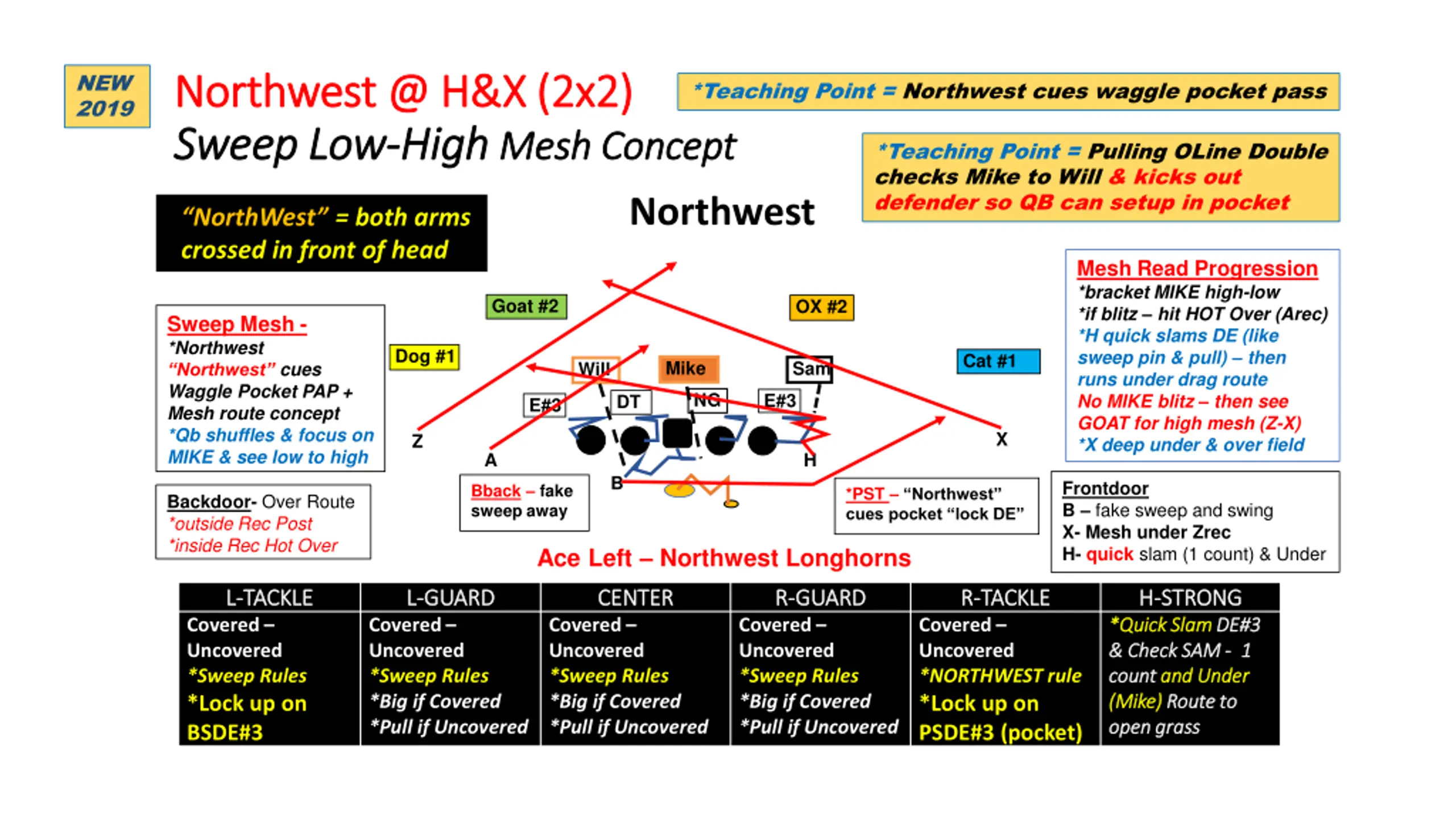 NEW 2019 Northwest @ H&X (2x2) Northwest @ H&X (2x2) Sweep Low Sweep Low- -High High Mesh Concept *Teaching Point = Northwest cues waggle pocket pass Mesh Concept *Teaching Point = Pulling OLine Double checks Mike to Will & kicks out defender so QB can setup in pocket Northwest NorthWest = both arms crossed in front of head Mesh Read Progression *bracket MIKE high-low *if blitz hit HOT Over (Arec) *H quick slams DE (like sweep pin & pull) then runs under drag route No MIKE blitz then see GOAT for high mesh (Z-X) *X deep under & over field Goat #2 OX #2 Sweep Mesh - *Northwest Northwest cues Waggle Pocket PAP + Mesh route concept *Qb shuffles & focus on MIKE & see low to high Dog #1 Cat #1 Mike Sam Will NG E#3 DT E#3 X Z A H B Frontdoor B fake sweep and swing X- Mesh under Zrec H- quick slam (1 count) & Under Bback fake sweep away *PST Northwest cues pocket lock DE Backdoor- Over Route *outside Rec Post *inside Rec Hot Over Ace Left Northwest Longhorns L L- -TACKLE TACKLE Covered Uncovered *Sweep Rules *Lock up on BSDE#3 L L- -GUARD GUARD Covered Uncovered *Sweep Rules *Big if Covered *Pull if Uncovered CENTER CENTER R R- -GUARD GUARD Covered Uncovered *Sweep Rules *Big if Covered *Pull if Uncovered R R- -TACKLE TACKLE Covered Uncovered *NORTHWEST rule *Lock up on PSDE#3 (pocket) H H- -STRONG STRONG *Quick *Quick Slam Slam DE#3 & Check SAM & Check SAM - - 1 1 count count and Under and Under (Mike) (Mike) Route to Route to open grass open grass Covered Uncovered *Sweep Rules *Big if Covered *Pull if Uncovered DE#3