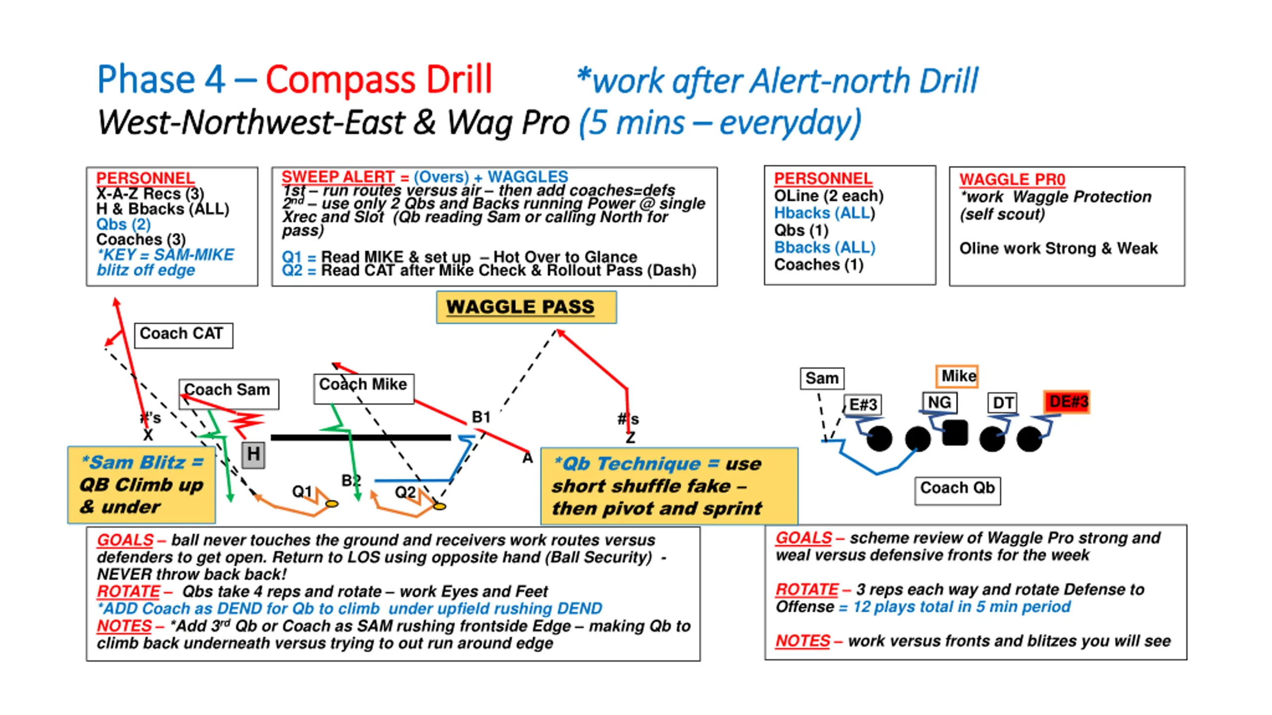 Phase 4 Phase 4 Compass Drill Compass Drill West West- -Northwest Northwest- -East & Wag Pro *work after Alert *work after Alert- -north Drill (5 mins everyday) everyday) north Drill East & Wag Pro (5 mins SWEEP ALERT = (Overs) + WAGGLES 1st run routes versus air then add coaches=defs 2nd use only 2 Qbs and Backs running Power @ single Xrec and Slot (Qb reading Sam or calling North for pass) PERSONNEL X-A-Z Recs (3) H & Bbacks (ALL) Qbs (2) Coaches (3) *KEY = SAM-MIKE blitz off edge PERSONNEL OLine (2 each) Hbacks (ALL) Qbs (1) Bbacks (ALL) Coaches (1) WAGGLE PR0 *work Waggle Protection (self scout) Oline work Strong & Weak Q1 = Read MIKE & set up Hot Over to Glance Q2 = Read CAT after Mike Check & Rollout Pass (Dash) WAGGLE PASS Coach CAT Mike NG Sam Coach Mike Coach Sam DE#3 DT E#3 B1 # s # s X Z H A *Sam Blitz = QB Climb up & under *Qb Technique = use short shuffle fake then pivot and sprint B2 Coach Qb Q1 Q2 GOALS scheme review of Waggle Pro strong and weal versus defensive fronts for the week GOALS ball never touches the ground and receivers work routes versus defenders to get open. Return to LOS using opposite hand (Ball Security) - NEVER throw back back! ROTATE Qbs take 4 reps and rotate work Eyes and Feet *ADD Coach as DEND for Qb to climb under upfield rushing DEND NOTES *Add 3rd Qb or Coach as SAM rushing frontside Edge making Qb to climb back underneath versus trying to out run around edge ROTATE 3 reps each way and rotate Defense to Offense = 12 plays total in 5 min period NOTES work versus fronts and blitzes you will see