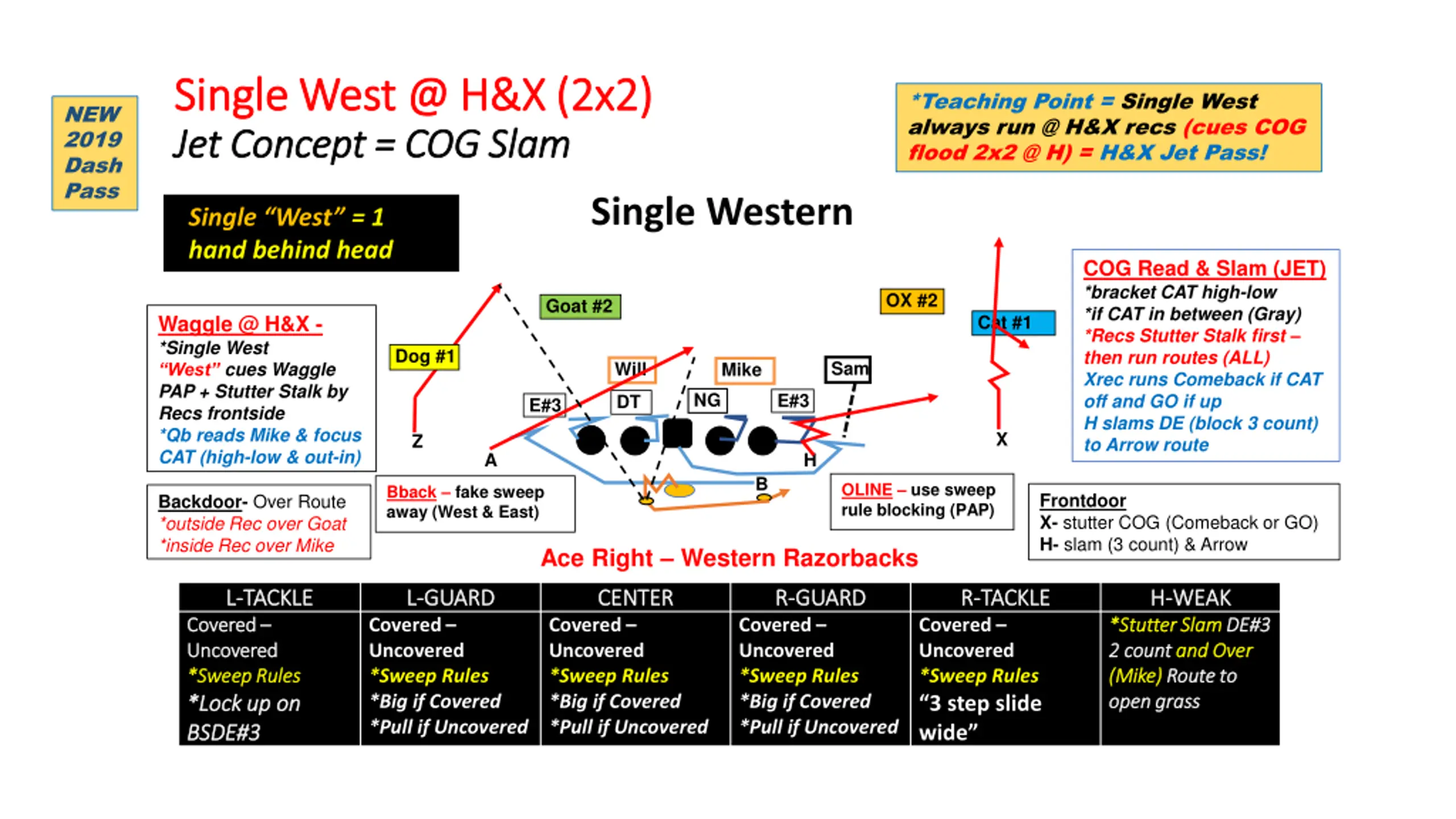 Single West @ H&X (2x2) Single West @ H&X (2x2) Jet Concept = COG Slam Jet Concept = COG Slam *Teaching Point = Single West always run @ H&X recs (cues COG flood 2x2 @ H) = H&X Jet Pass! NEW 2019 Dash Pass Single Western Single West = 1 hand behind head COG Read & Slam (JET) *bracket CAT high-low *if CAT in between (Gray) *Recs Stutter Stalk first then run routes (ALL) Xrec runs Comeback if CAT off and GO if up H slams DE (block 3 count) to Arrow route OX #2 Goat #2 Waggle @ H&X - *Single West West cues Waggle PAP + Stutter Stalk by Recs frontside *Qb reads Mike & focus CAT (high-low & out-in) Cat #1 Dog #1 Sam Will Mike NG E#3 DT E#3 X Z A H B OLINE use sweep rule blocking (PAP) Bback fake sweep away (West & East) Frontdoor X- stutter COG (Comeback or GO) H- slam (3 count) & Arrow Backdoor- Over Route *outside Rec over Goat *inside Rec over Mike Ace Right Western Razorbacks L L- -TACKLE TACKLE Covered Covered Uncovered Uncovered *Sweep *Sweep Rules *Lock up on *Lock up on BSDE#3 BSDE#3 L L- -GUARD GUARD Covered Uncovered *Sweep Rules *Big if Covered *Pull if Uncovered CENTER CENTER R R- -GUARD GUARD Covered Uncovered *Sweep Rules *Big if Covered *Pull if Uncovered R R- -TACKLE TACKLE Covered Uncovered *Sweep Rules 3 step slide wide H H- -WEAK WEAK *Stutter *Stutter Slam 2 count 2 count and Over and Over (Mike) (Mike) Route to Route to open grass open grass Covered Uncovered *Sweep Rules *Big if Covered *Pull if Uncovered Slam DE#3 DE#3 Rules