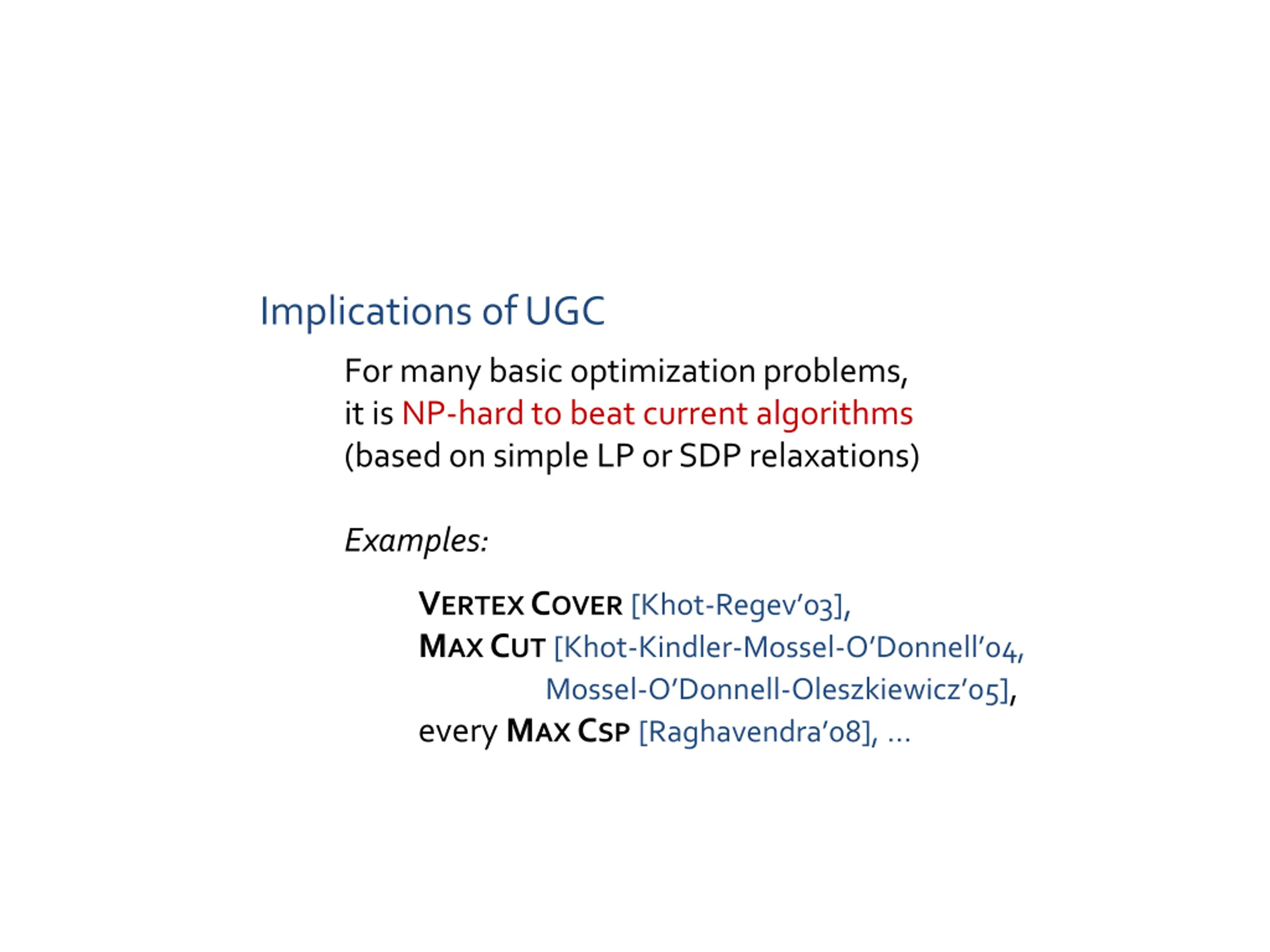 Implications of UGC For many basic optimization problems, it is NP-hard to beat current algorithms (based on simple LP or SDP relaxations) Examples: VERTEX COVER[Khot-Regev 03], MAX CUT[Khot-Kindler-Mossel-O Donnell 04, Mossel-O Donnell-Oleszkiewicz 05], every MAX CSP[Raghavendra 08],