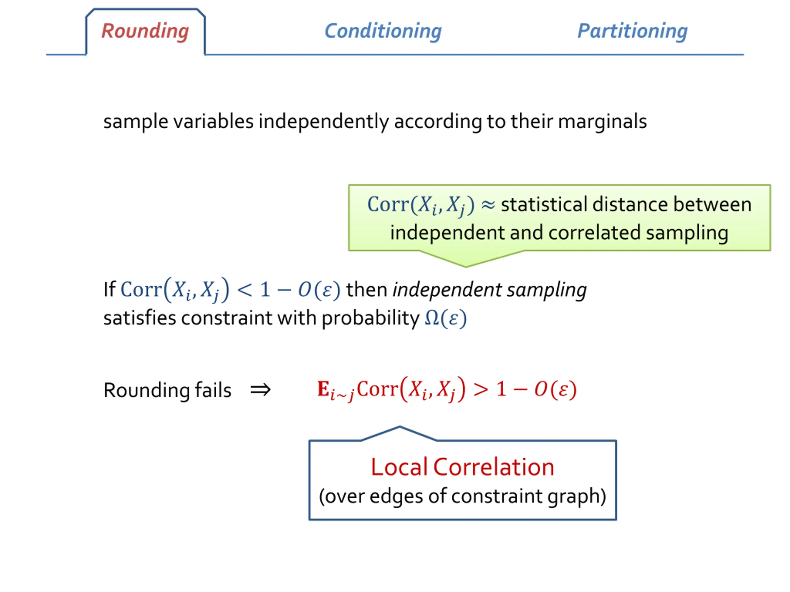 Rounding Conditioning Partitioning sample variables independently according to their marginals Corr(??,??) statistical distance between independent and correlated sampling If Corr ??,?? < 1 ?(?) then independent sampling satisfies constraint with probability (?) Rounding fails ?? ?Corr ??,?? > 1 ?(?) Local Correlation (over edges of constraint graph)