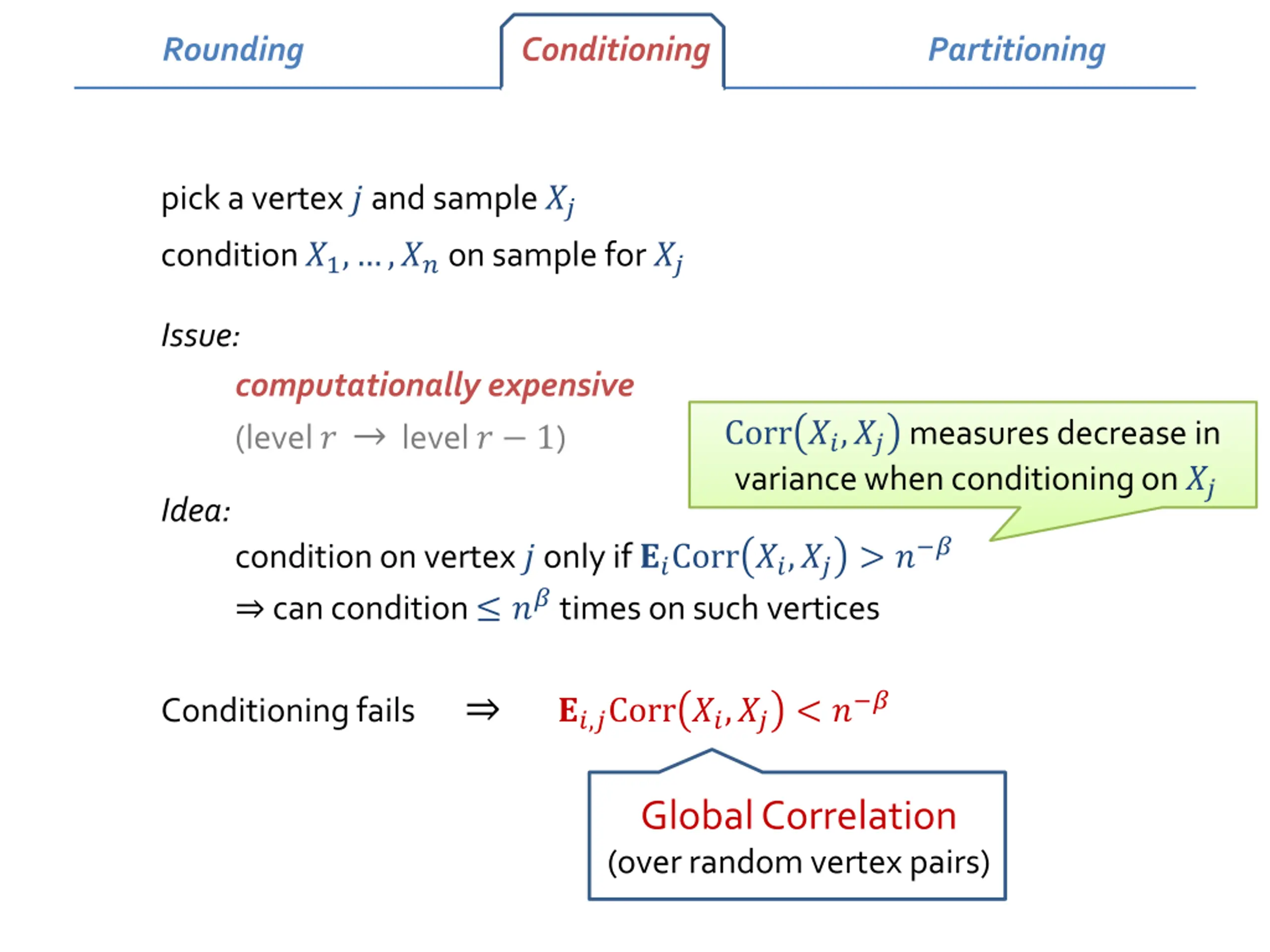 Rounding Conditioning Partitioning pick a vertex ? and sample ?? condition ?1, ,?? on sample for ?? Issue: computationally expensive (level ? level ? 1) Corr ??,?? measures decrease in variance when conditioning on ?? Idea: condition on vertex ? only if ??Corr ??,?? > ? ? can condition ?? times on such vertices Conditioning fails ??,?Corr ??,?? < ? ? Global Correlation (over random vertex pairs)