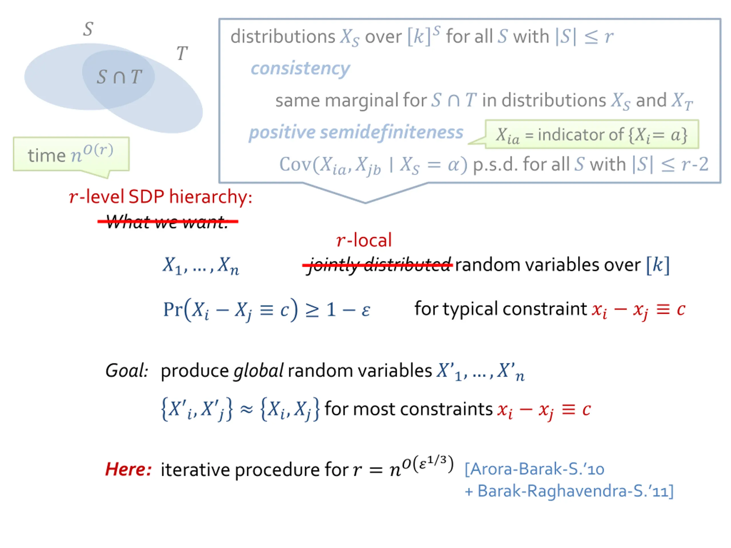 ? distributions ?? over ?? for all ? with ? ? consistency ? ? ? same marginal for ? ? in distributions ?? and ?? positive semidefiniteness ??? = indicator of {??= ?} time ?? ? Cov(???,??? ??= ?) p.s.d. for all ? with ? ?-2 ?-level SDP hierarchy: What we want: ?-local jointly distributed random variables over [?] ?1, ,?? for typical constraint ?? ?? ? Pr ?? ?? ? 1 ? Goal: produce global random variables ? 1, ,? ? ? ?,? ? ??,?? for most constraints ?? ?? ? Here: iterative procedure for ? = ?? ?1/3 [Arora-Barak-S. 10 + Barak-Raghavendra-S. 11]